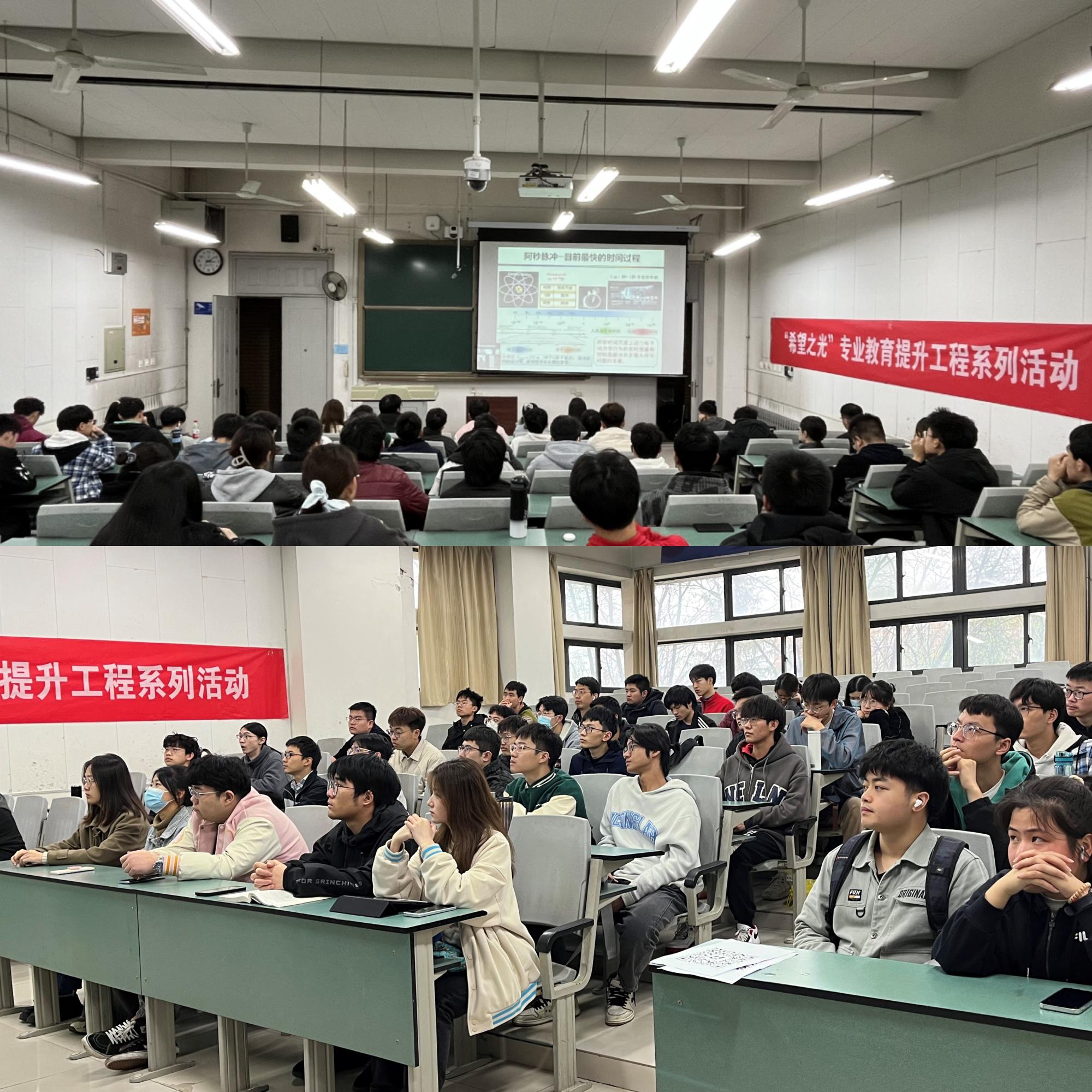 “希望之光”系列大讲堂第四讲在北校区会议中心104报告厅开讲,中国科学院物理研究所研究员魏志义应邀作题为“超快激光——从科学前沿、高技术产业到大科学设施”的学术报告。报告会由院长邵晓鹏主持。学院同步在南校区A220教室设立分会场,百余名师生参加本次活动。