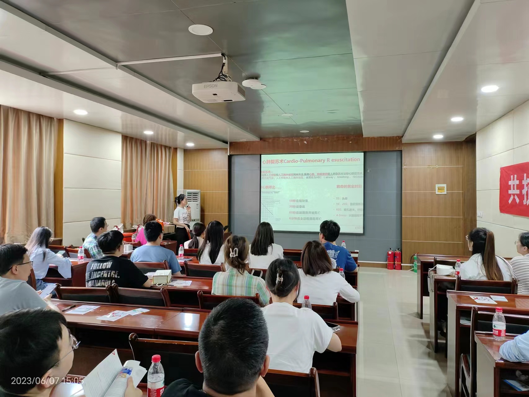 王丽虹讲解了心肺复苏术(CPR)的原理和操作技巧,强调了在心脏骤停的紧急情况下,正确的CPR操作可以提高患者的生存率,即“黄金四分钟”,让师生们意识到急救要与时间进行赛跑,拯救生命刻不容缓。