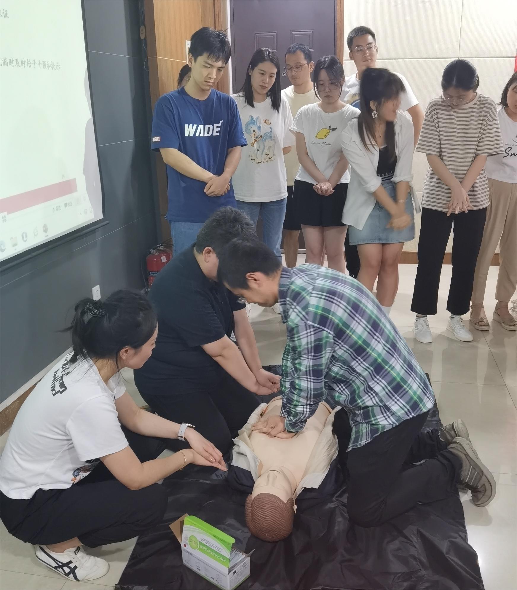 最后,张欢讲解了心肺复苏术(CPR)的具体操作步骤,利用人体模型现场演示了心肺复苏的完整操作流程,师生在实操练习环节亲自上台体验,校医院医生手把手进行指导。师生组成8人小组,模拟了心脏骤停、溺水、出血等场景的一次急救演练,通过发现人员心脏骤停、拨打120急救电话、实施CPR、快速取到AED除颤仪等一系列模拟环节,师生感受到救护生命刻不容缓,体会到黄金四分钟的重要性。培训现场学习气氛高涨,大家纷纷表示本类实践培训收获颇丰,受益匪浅。