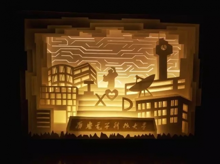 2017届毕业生以“光影西电”纸雕灯箱的形式,描绘了他们心中的西电,并将其赠予母校,以此表达自己的西电情。
