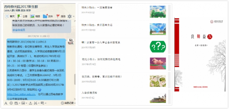为做好学院新生接待工作,确保新生顺利报到,学院提前召开迎新工作协调会,对整个迎新接待工作的各个环节进行了细致周密的部署,并利用暑期对一系列工作紧锣密鼓进行筹备。7月底开始,学院官微“西电物光院”就逐步制作推出“物光小贴士,走进西电生活”、“欢迎你,2017物光er”等新生系列特辑,帮助新生提前了解学校学习、生活环境;新生辅导员和高年级学生创建“2017物光er”QQ、微信讨论群,对有关军事训练、入学考试、卓越教改班选拔等新生最为关注的相关事宜做了及时解答;专职教师结合学院特色专业方向,以访谈寄语的形式表达对新生的欢迎和期许,学院将其整理编辑,印制成精美的《良师益友》画刊,作为“新生入学礼”赠送给每一位新生。