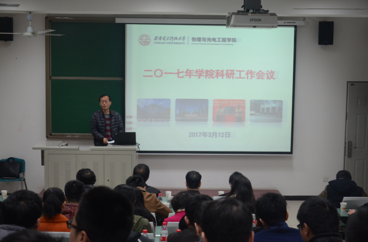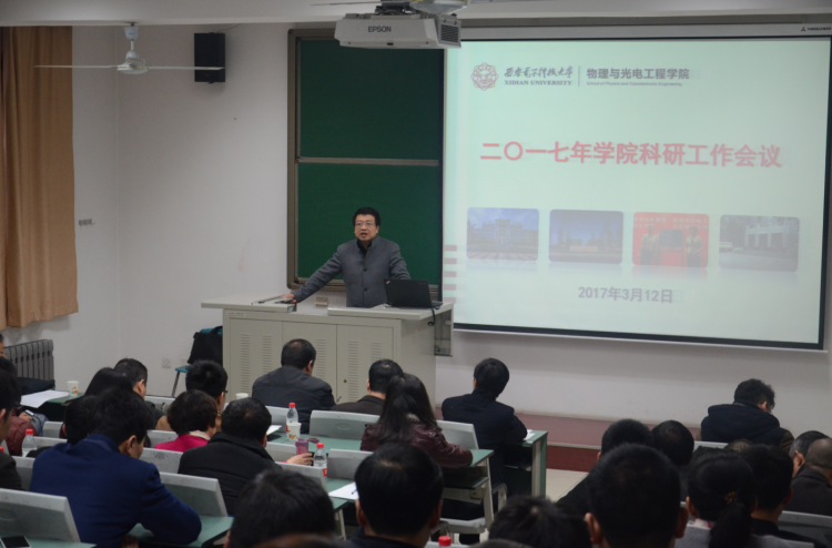 于北校区西大楼219教室召开2017年学院科研工作会议,旨在总结年度工作,凝练发展方向,交流心得体会,共同谋划学院科研工作的发展大局。副校长杨银堂、科研院常务副院长石光明、副院长蔡固顺、院长助理刘珠梅等领导干部,物光院领导班子及全体教师参加了此次会议。会议由学院副院长邵晓鹏主持。
