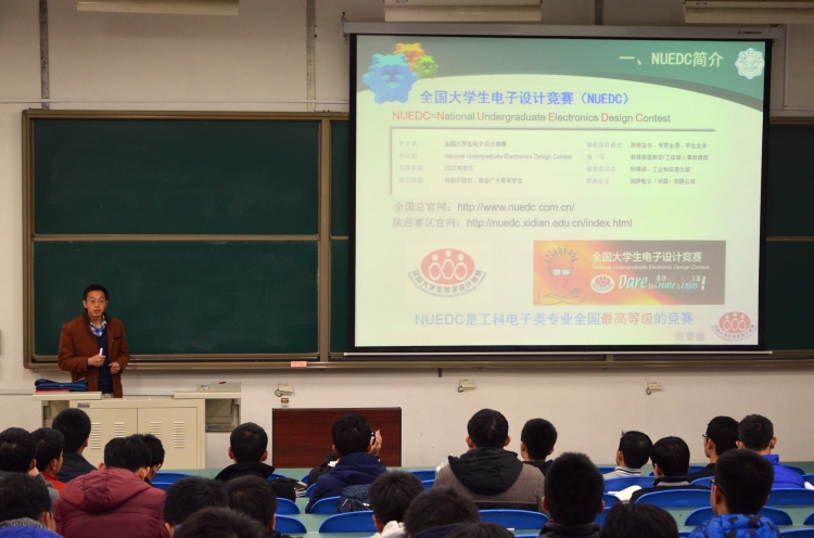 (通讯员田佳怿)2016年12月5日晚,学院在b楼443教室举办电赛宣讲会。副院长周慧鑫教授应邀主讲,旨在为有意参加2017年全国大学生电子设计竞赛(NUEDC)的同学从报名准备到项目创作等方面提供帮助,给予建议。