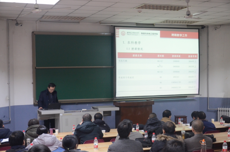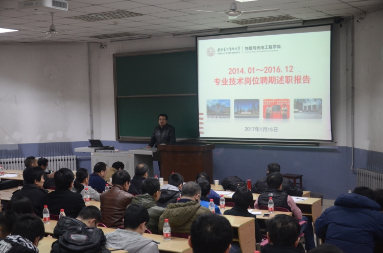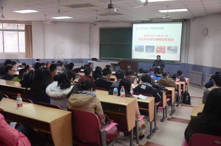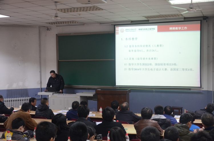 于北校区阶梯教室101举办2016年度青年教师年度暨聘期考核汇报会,学院45周岁以下青年教师对自己本聘期内的各项工作进行总结汇报。学院领导班子、学术委员会成员及各系室主任担任评委,会议由副院长周慧鑫主持。