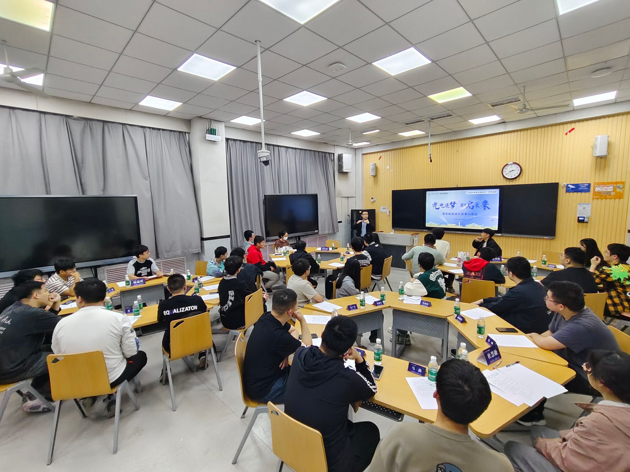 “学长,在短期的工作机会与长期的职业规划之间,如何找到平衡?”“光电逐梦,职启未来”青年校友成长故事分享会在C楼教室举办,西安诺瓦星云科技股份有限公司林先萌校友(2008级电子科学与技术专业本科),华为技术有限公司张虎强校友(2020级光学工程专业硕士)、韩漫基地