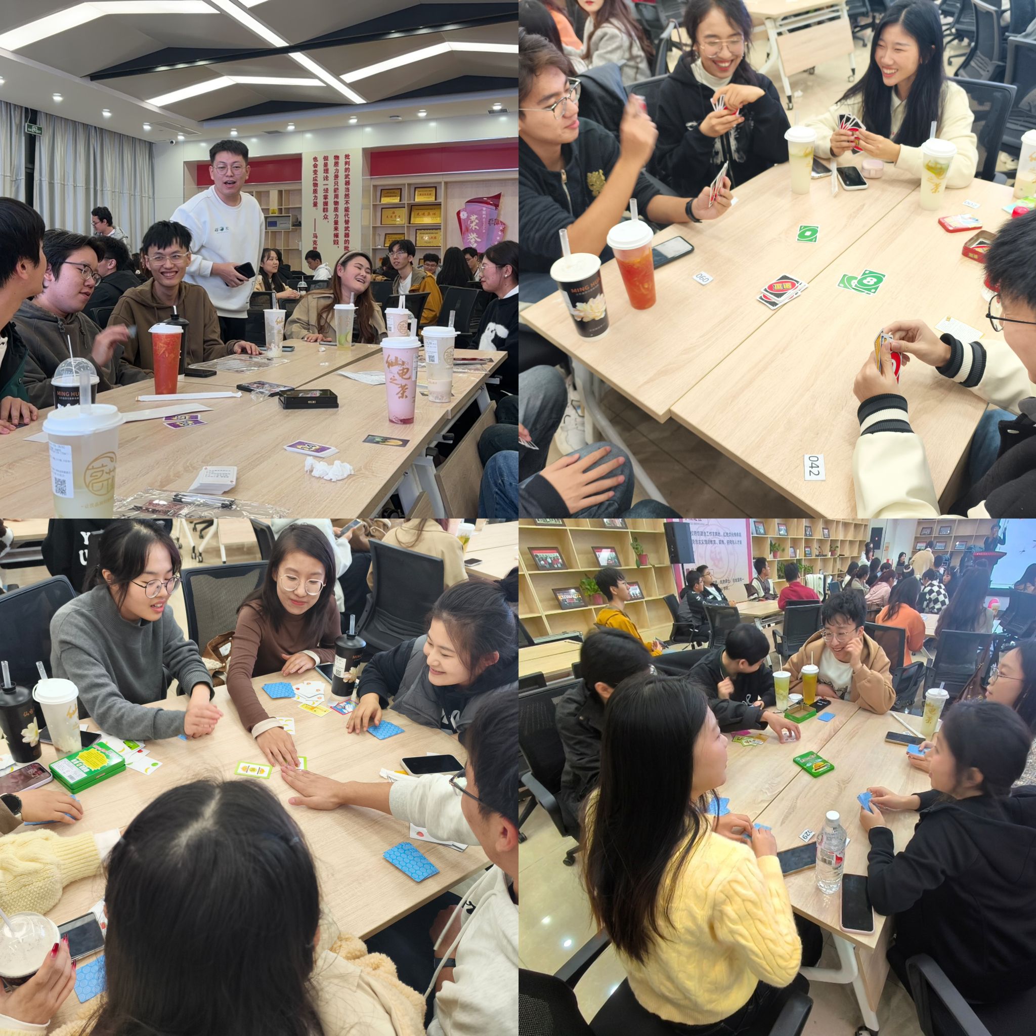 在欢声笑语中,活动进入了最精彩的篇章—自由交流的桌游时光。《三国杀》的智谋对决、《狼人杀》的推理博弈、《德国心脏病》的心跳体验、《谁是卧底》的思维碰撞以及《UNO》等休闲卡牌游戏,让同学们在不同游戏中各得其乐。大家围桌而坐,或沉浸于角色扮演,或专注于逻辑推理,或享受着轻松氛围,互动频繁,交流深入,现场气氛热烈。