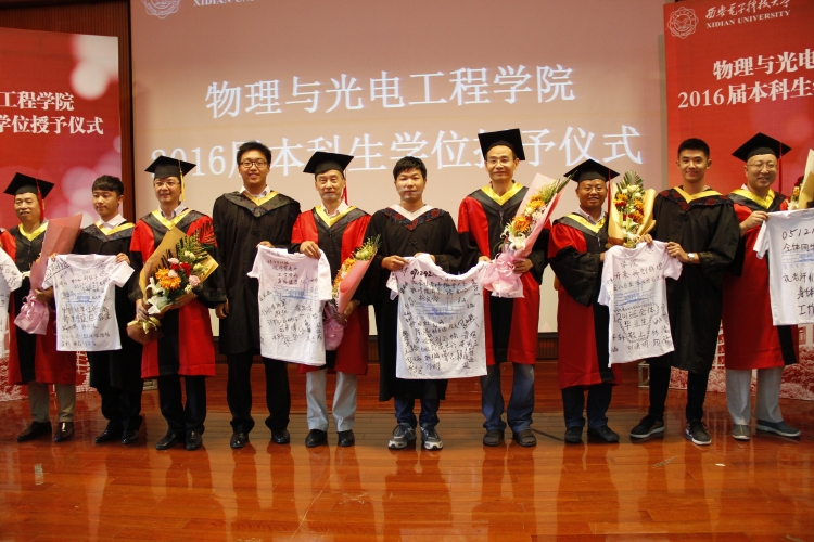 授位仪式后,2016届毕业生代表向出席仪式的各位老师献花,并送上带有全体毕业生签名的T恤,以感谢学校和学院的辛勤培育。几位老师也向毕业生赠予了带有“物理与韩漫基地