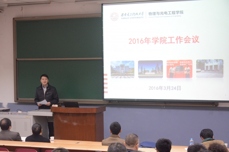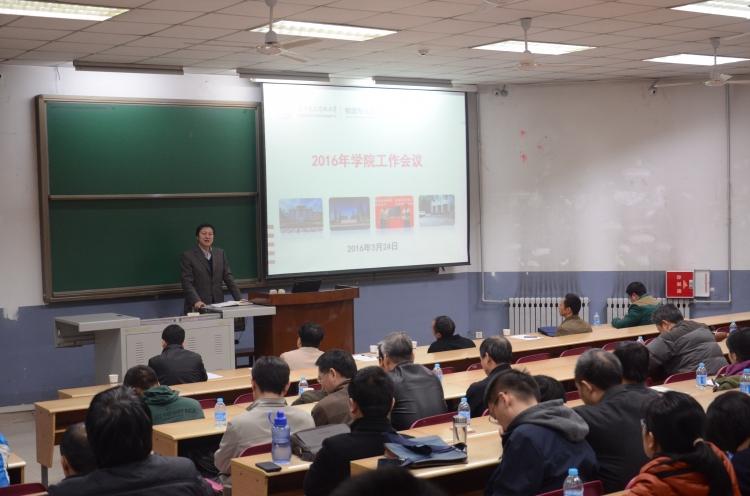 于北校区阶梯教学楼110召开2016年工作会议暨领导班子成员民主测评会。副校长陈勇出席会议并讲话,学院全体教职工参加会议。大会由学院党委书记杨光暐主持。