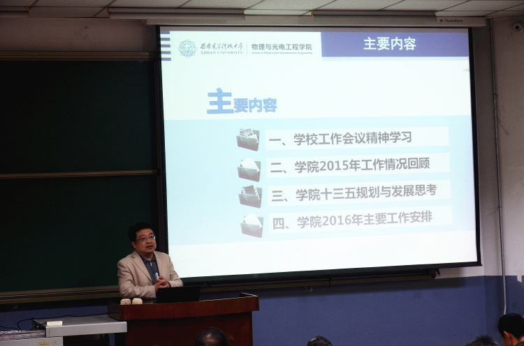 会上,执行院长郭立新做了学院工作报告。向全院教职工传达了学校2016年工作会议的主要精神,并在全面回顾学院2015年工作情况的基础上,分析阐述了学院“十三五”规划的总体思路,并围绕师资队伍、人才培养、学科科研、国际合作等方面提出了明确的发展方向,并对核心指标进行了量化。他鼓励大家要举全院之力,把学院建设成特色鲜明、国内一流、国际先进的研究型学院。结合2016年学院具体工作安排,他谈到要求全院上下要坚持问题导向,勇于承担责任,破解发展难题。