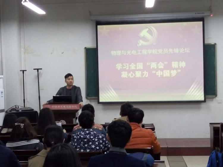 本次论坛的主题为学习全国“两会”精神,凝心聚力“中国梦”。论坛选取了5名优秀学生党员分别以“环保问题”、“创新创业”、“大学生就业难”、“下岗潮”等为主题进行了演讲。在全体论坛成员一起学习两会精神中与大学生学习生活息息相关的内容外,这5名同学还从自身学习发展、党员思想要求、党的建设内容、国家社会现状等角度发表了自己学习党章党建、政府报告、时事报道的理解,并提出学生党员需要更加认真细致地阅读党章和政府报告,时刻关注时政大事,与时俱进,不断提升自身思想素质,增强党员意识,立足于自身学习,发挥党员的模范先锋作用。论坛还进行了“两学一做”活动宣讲。“两学一做”基础在学,要夯实“学”这个基础。就要明确基本目标,树立行为规范。“学系列讲话”,就要深刻认识习近平总书记系列重要讲话。经过学习讨论,广大同学纷纷表示要加强责任意识,争做合格党员,要以饱满的热情参与各类社会实践活动和青年志愿者服务,为学校会发展做出力所能及的贡献。