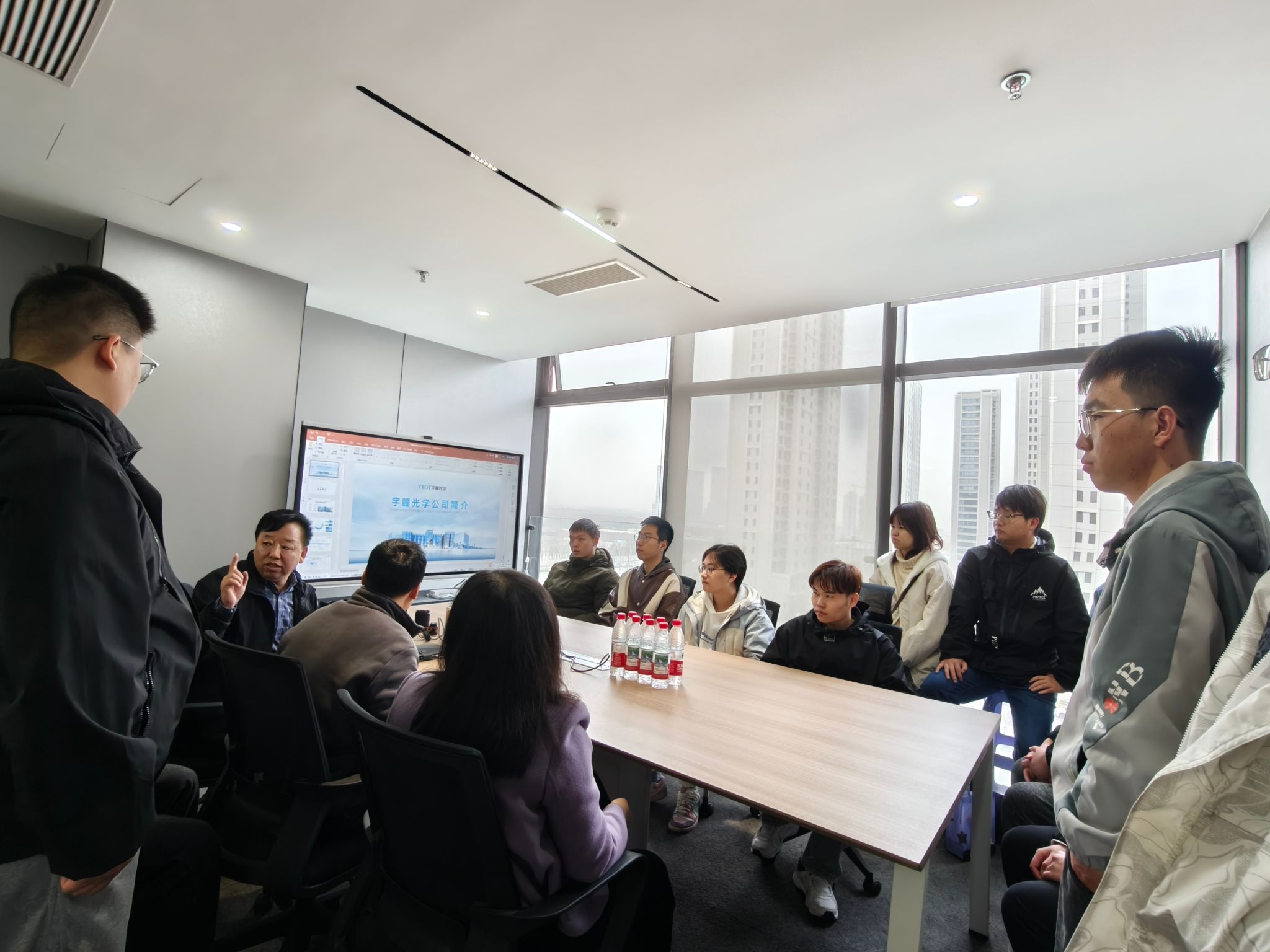 在宇瞳光学科技股份有限公司西安分公司,负责人高明介绍了公司的机构分布、业务领域、研发团队等情况,以及在超快光学、AI与光学设计结合等方面的人才招聘需求。独国社介绍了学校、学院基本情况,表示希望以此次交流为契机,充分发挥双方专业、人才、资源等优势,通过项目合作、技术交流和人才培养等方式与公司建立常态化互动交流机制、深化产学研合作。双方就加强供需对接、推动学生就业实践等进行交流,高明对现场同学的疑惑一一解答,为同学们提供了成长发展与择业就业的宝贵建议。