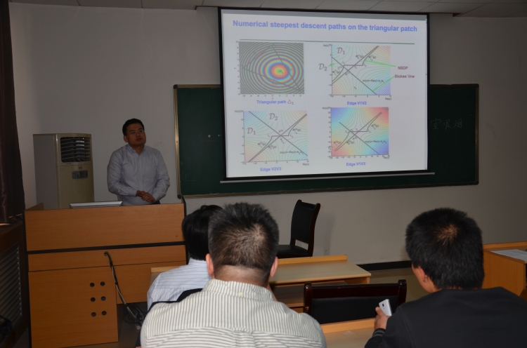报告会上,吴语茂介绍了用来分析电大二次曲面上杂散电磁场的表面积分方程算法,提出了用来求解高频杂散场的数值最速下降路径法,并且对纳米周期材料的电磁散射快速算法进行了简单介绍。台下听众兴趣盎然,多位老师、同学与吴语茂进行了深入探讨。