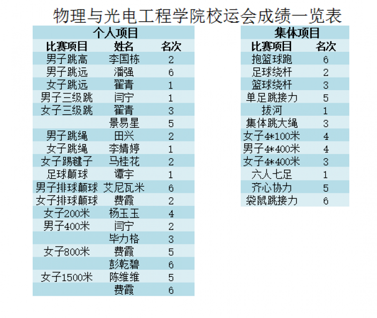 代表队第二次踏上了校运会的征程。赛前,在院领导的统筹下,各项活动的训练有条不紊地展开。全体辅导员老师与众多同学一道,积极主动奉献出自己宝贵的休息时间,投入到跳大绳、拔河、六人七足以及开幕式舞蹈等活动的训练当中。相关组织和部门也在积极筹备运动会所需的物资,如帐篷、桌椅、食物和饮品等,同时还为参加比赛的运动员特意购置了葡萄糖和钉鞋。精心的筹备终于在赛场上得到了回报,运动会期间,我院代表队的入场舞博得了观众的一致好评,团体趣味项目表现依然抢眼,众多个人项目同样捷报频传。在传统优势项目六人七足中,我院以压倒性优势蝉联冠军;在强手如林的拔河赛场上,更是以全胜战绩傲视群雄;男子三级跳、足球颠球以及女子跳远、跳绳等单人项目我们同样当仁不让,勇折桂冠。这些都是我院代表队科学训练,辛苦付出的最好证明。然而比所取得的成绩更重要的是,本次运动会极大地凝聚了全院上下的人心,鼓舞了士气,同时也充分激发出了大家的集体荣誉感,让大家感受到了体育运动真正的魅力所在。