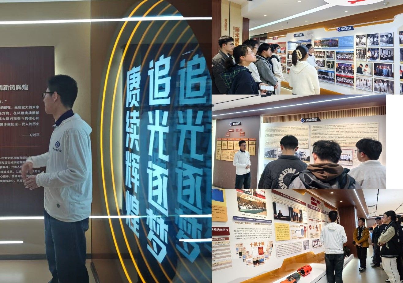 在光机所史馆,同学们认真参观了馆内陈列的龚祖同等老一辈科学家的手稿、实验仪器原型及重大科研成果模型,生动展现了光机所60余年服务国家战略需求的历程。同学们驻足“追光逐电,赓续辉光”展区前,深入了解科研团队突破技术封锁、实现关键设备国产化的励志事迹。
