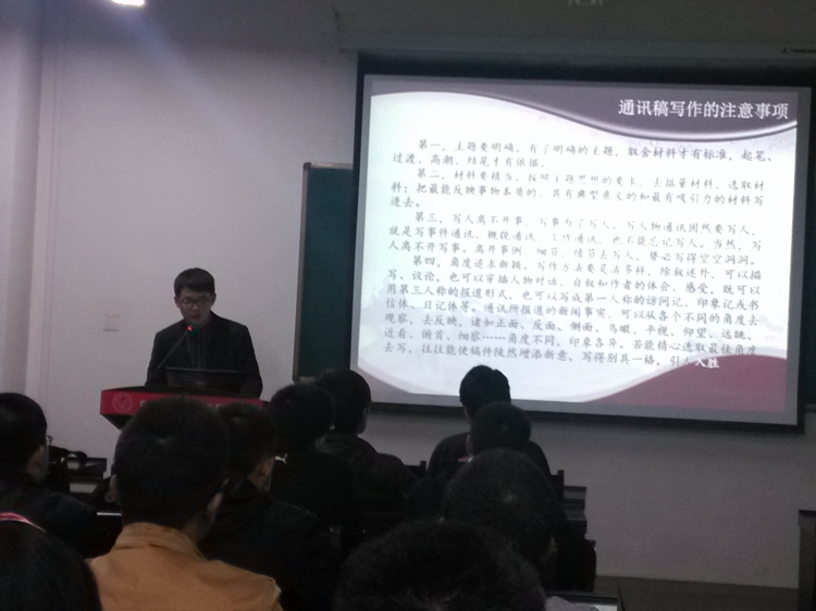学生事务委员会在E楼III区315学术报告厅举行了学生干部通讯稿写作培训,由院学生事务委员会洪邑晖学长主讲,到场的有学院各组织秘书处成员和2013级各班通讯员。