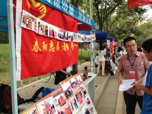 团委读书社、辩论队和“春雨”志愿者在海棠餐厅南侧举办招新外场,团委副书记及社团负责人参与了此次招新活动。