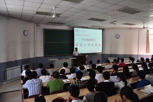在北校区教学楼101教室召开2013级研究生新生入学见面会,学院筹备领导小组组长郭立新,以及筹备领导小组成员杨光暐、李平舟、周慧鑫到场与2013级研究生新生见面,并对大家来我院继续深造学习表示热烈的欢迎。