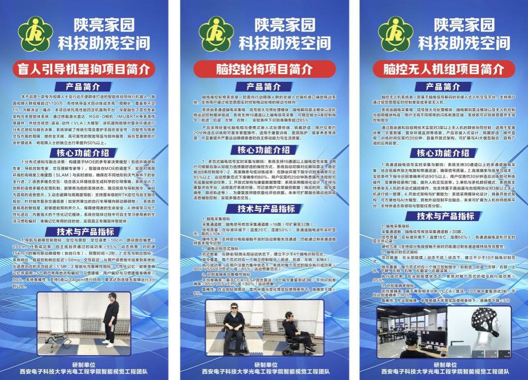 共展出盲人引导机器狗、脑控轮椅和脑控无人机组等智能助残设备。盲人引导机器狗搭载激光雷达、深度相机与多模态融合算法,具备实时感知、语音交互、动态避障、高精度导航、持续学习与个性化适应等功能。脑控轮椅采用非侵入式脑机接口辅助移动系统,残障人士通过视觉意图实时控制轮椅的移动。该系统已通过基础安全测试,目前通过视觉意图操控,后续将研究通过意想操控。脑控无人机组是基于脑电信号解码的非侵入式人机交互平台,残障人士通过视觉意图实时控制无人机。