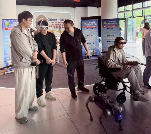 在研究生党员骨干全程监护下,两名陕亮家园在托残障人士分别试用了导盲机器狗的基础跟随功能、脑控轮椅的前进停止功能,观摩了脑控无人机的模拟操作界面,通过头套尝试了意念指令输出,成功触发起飞预备信号,凭借意念成功让轮椅前行数米。