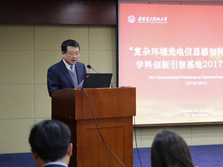 执行院长郭立新教授上台致辞。他首先代表基地工作组的全体成员对学校的大力支持、学者的辛勤付出表示感谢。他谈到,“复杂环境光电信息感知科学与技术”学科创新引智基地面向国家光电工程领域重大战略需求,依托智能感知与图像处理、新型激光器件与光信息处理、无线电物理三个省部级实验室建立,致力于解决未来复杂环境光电信息感知与处理中的关键科学问题。通过采用“引进、吸收消化、再创新”的战略思路,引进海外著名学者和高层次的研究人员,培养国际化的高层次人才和创新团队,深入开展高水平的国际科研交流与合作,力争打造一个在国内具有示范性的战略性、国际化的光电信息感知与处理领域的科学研究、高层次人才培养和国际学术交流的合作创新基地。他希望通过学术年会这一交流平台,深入研讨,增进友谊,共谋发展,将“复杂环境光电信息感知科学与技术”学科创新引智基地打造成为光电信息感知与处理领域内具有国际影响力的学术交流平台。