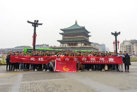 委员会承办的“一元钱城市生存挑战赛”在西安市钟楼商业区正式拉开帷幕。通过本次活动,将筹集的资金部分捐赠给“彩云协会”,用于为云南省昭通市镇雄县常院小学的学生购置书架等学习用品,为山区脱贫贡献一份力量。本次活动有来自各学院的14支队伍共56名学生参加比赛。参赛的所有同学用仅有的一元钱,与工作人员们一起从钟楼出发,走向社会,切实地感受来自生活中方方面面的挑战。