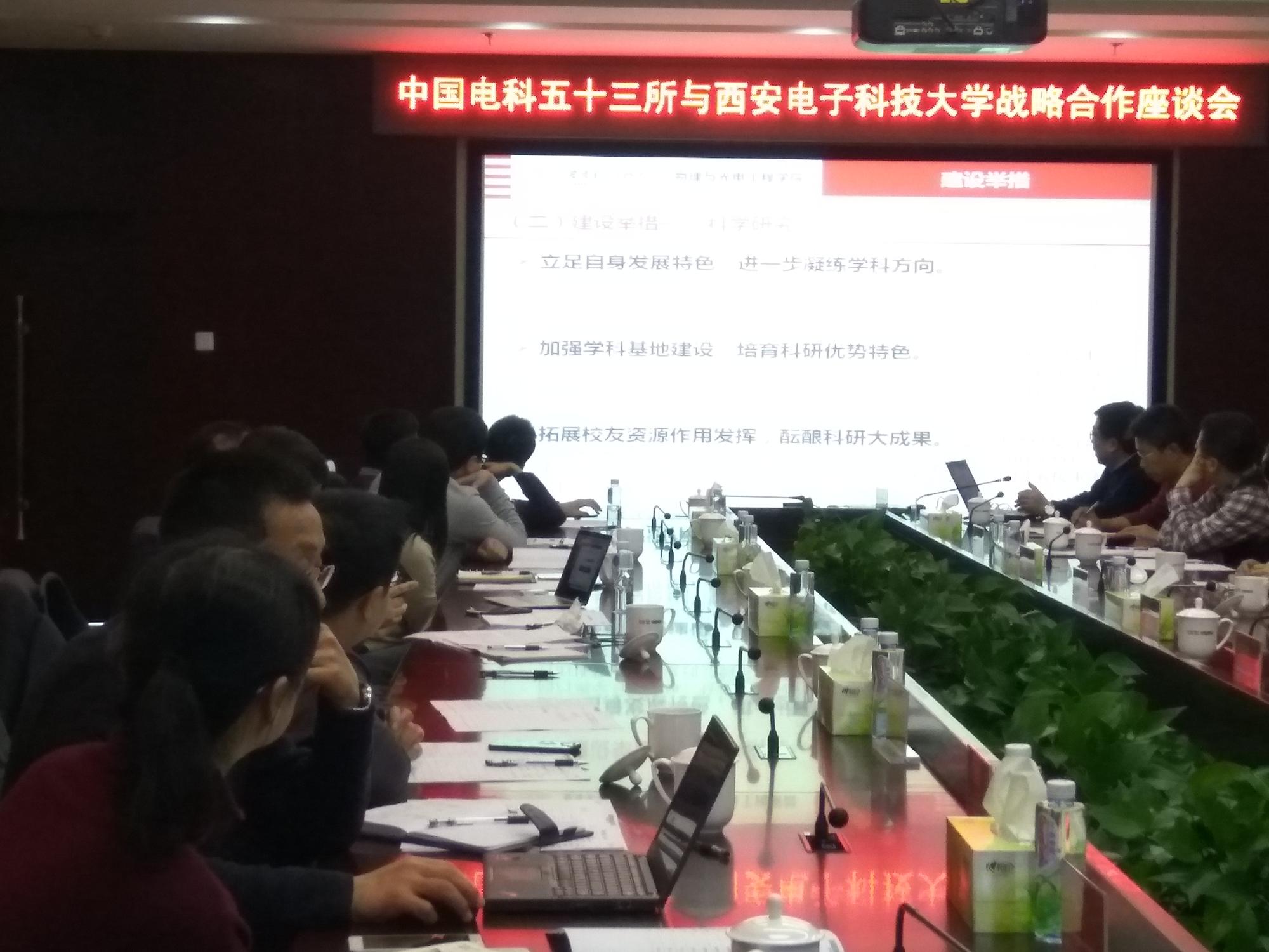 会上,庞国荣对学院的到访表示欢迎,并简单介绍了中电53所的发展历程和基本情况,在谈话中他指出,自2014年起,中电53所与西电的战略合作伙伴关系已经走过了三个年头,期间双方合作融洽、互帮互助、共同发展,在相关合作领域取得了一定的成绩,双方应继续营造和谐积极的合作氛围,争取更上一层楼。随后,王锴结合光电信息控制和安全技术重点实验室的相关工作,从光电探测、光电预警、光电告警、光电成像等多个方面,具体讲解了目前实验室的研发焦点。