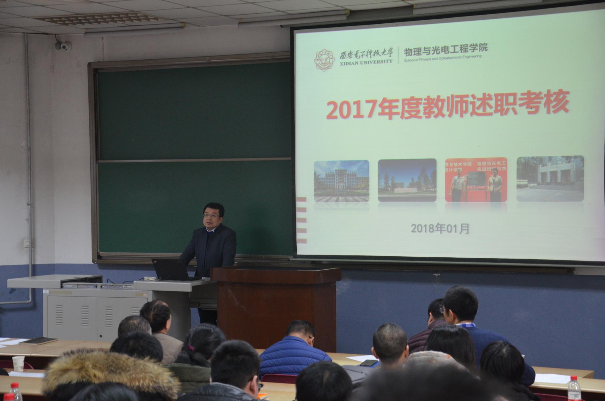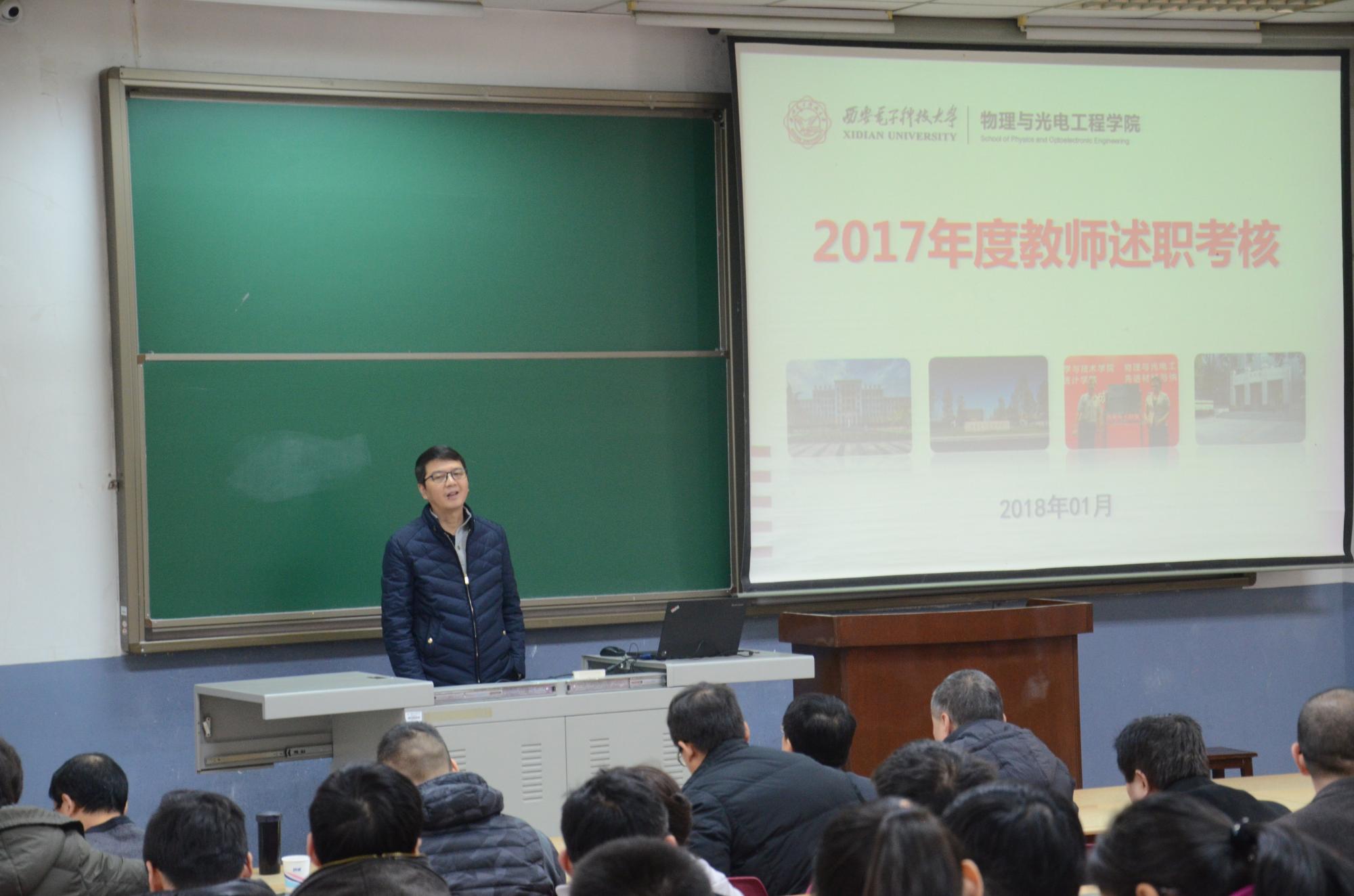 于北校区J-101教室举办2017青年教师年度考核述职报告会,学院40周岁以下青年教师逐一上台,就本年度的工作成果进行总结汇报。学院领导班子、学术委员会全体成员作为评委参加本次活动,学院全体教师与会,参与整个活动全过程。报告会由学院党委书记杨光暐主持。