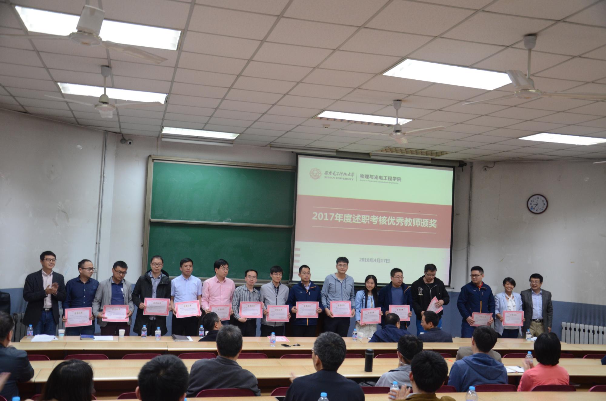 会议根据《关于表彰奖励2017年度述职考核优秀教师的决定》(物光院字[2018]7号)文件,李建东、杨光暐、郭立新等领导分别为学院2017年度扎实工作、锐意创新、贡献突出的20位40岁以内年度述职考核优秀的青年教师颁发了奖金和获奖证书。