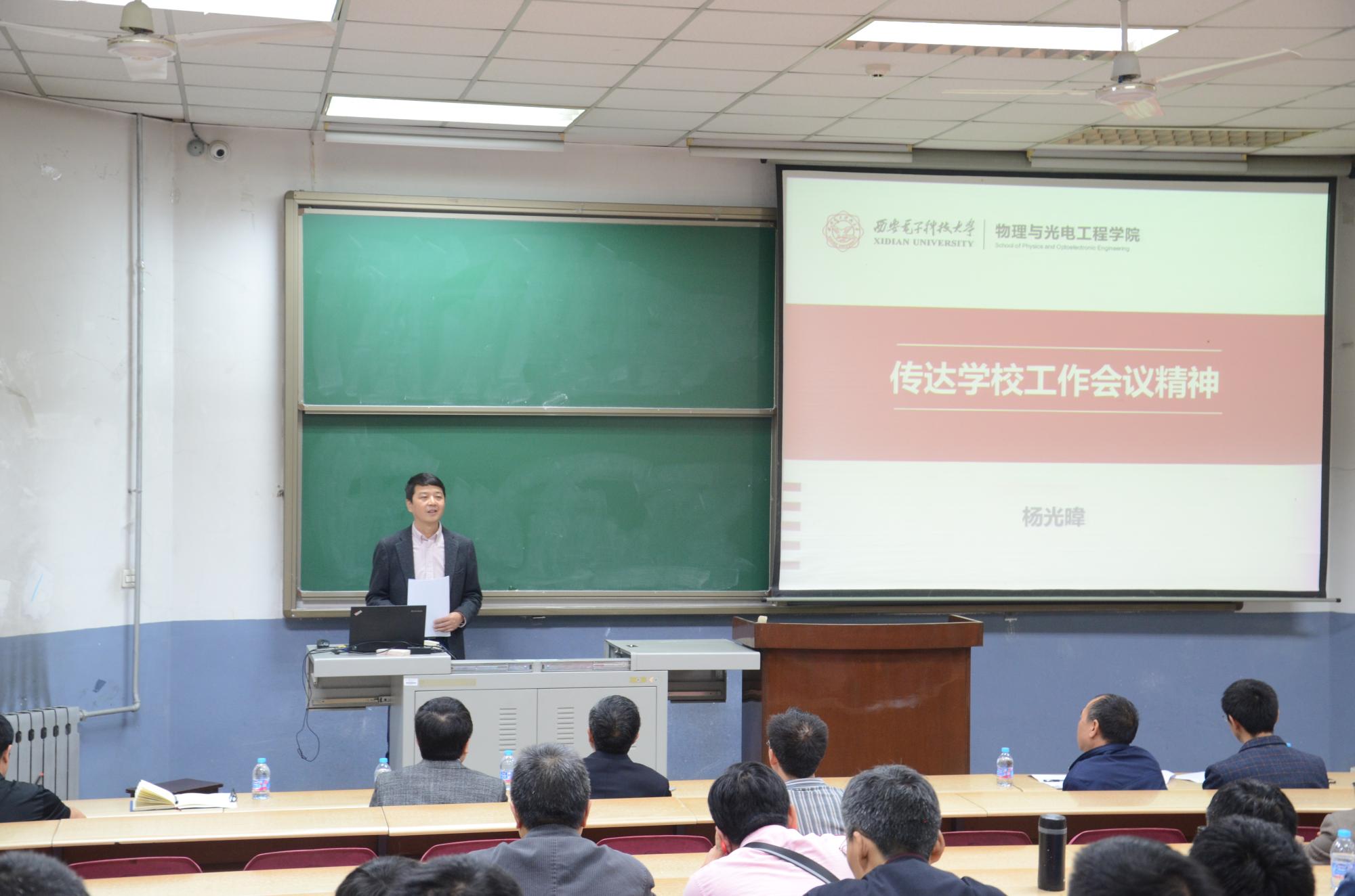 会上,学院党委书记杨光暐首先传达了学校相关会议精神。他谈到,2018年是贯彻党的十九大精神的开局之年,学校顺利召开十二次党代会、五届五次教代会、学校工作会,确立了学校发展的战略规划,明确了综合改革的总体目标、基本思路和路径方法,学院党委作为承上启下的关键一环,作为推动学院发展的核心力量,必须自觉加强自身建设,切实承担起办学治院的主体责任,特别是在“全面从严治党,以党建为统领,推进学校战略大发展”方面出实招、见实效,着力激发基层党组织活力,调动党员干部工作热情,全面配合各项政策落地,助力学校内涵式发展,促进学院快速发展。他强调,全体教职工应加强主人翁意识,充分发挥主观能动性,密切关注学校发展、投身学校建设、支持学校改革。