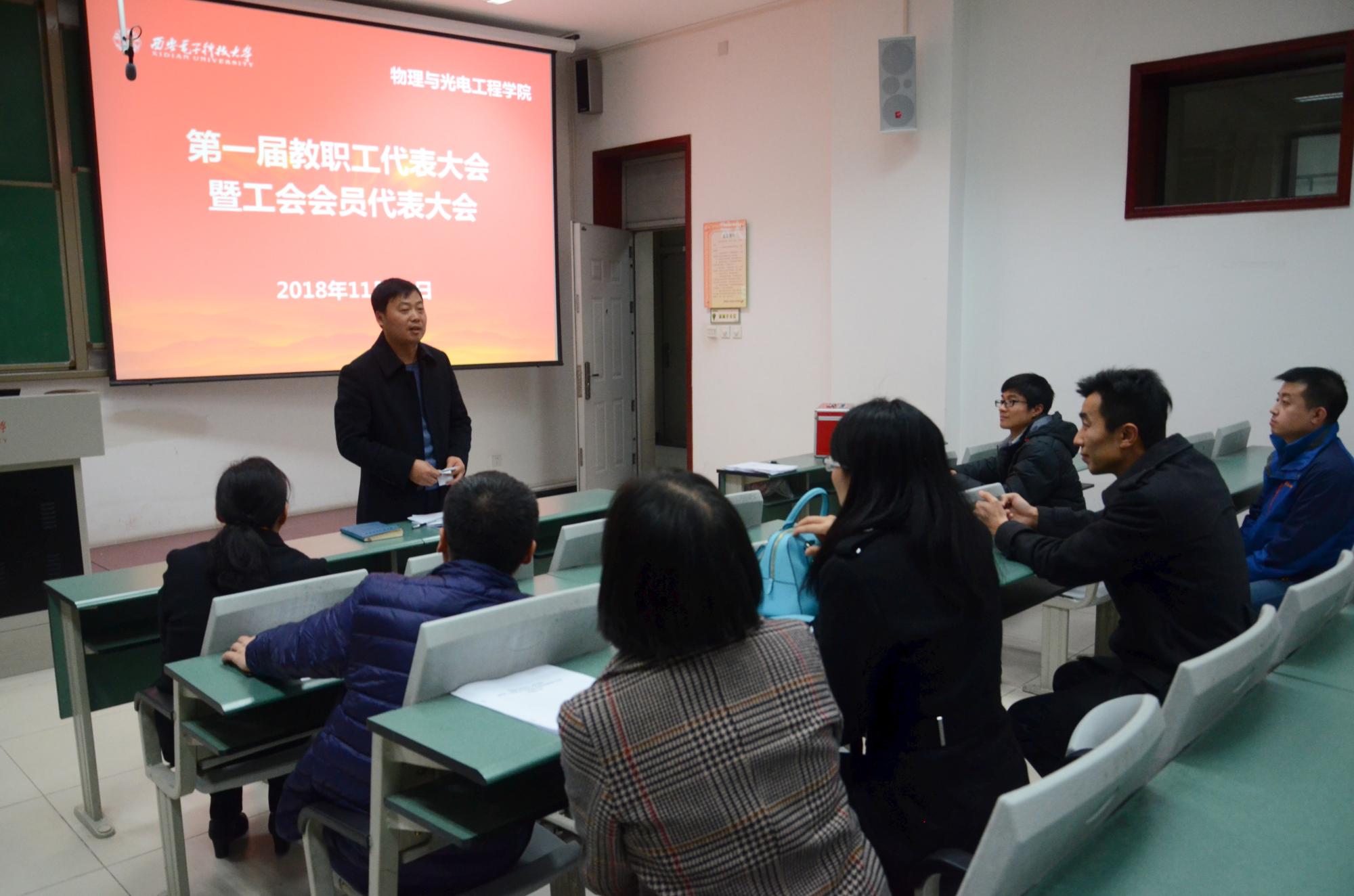 学院党委副书记、纪委书记林波主持召开物光院第一届工会会员代表大会。大会就前期推荐产生的11位工会委员候选人进行了差额选举,最终投票产生了9位学院新一届工会委员,并选举独国社为学院工会主席。