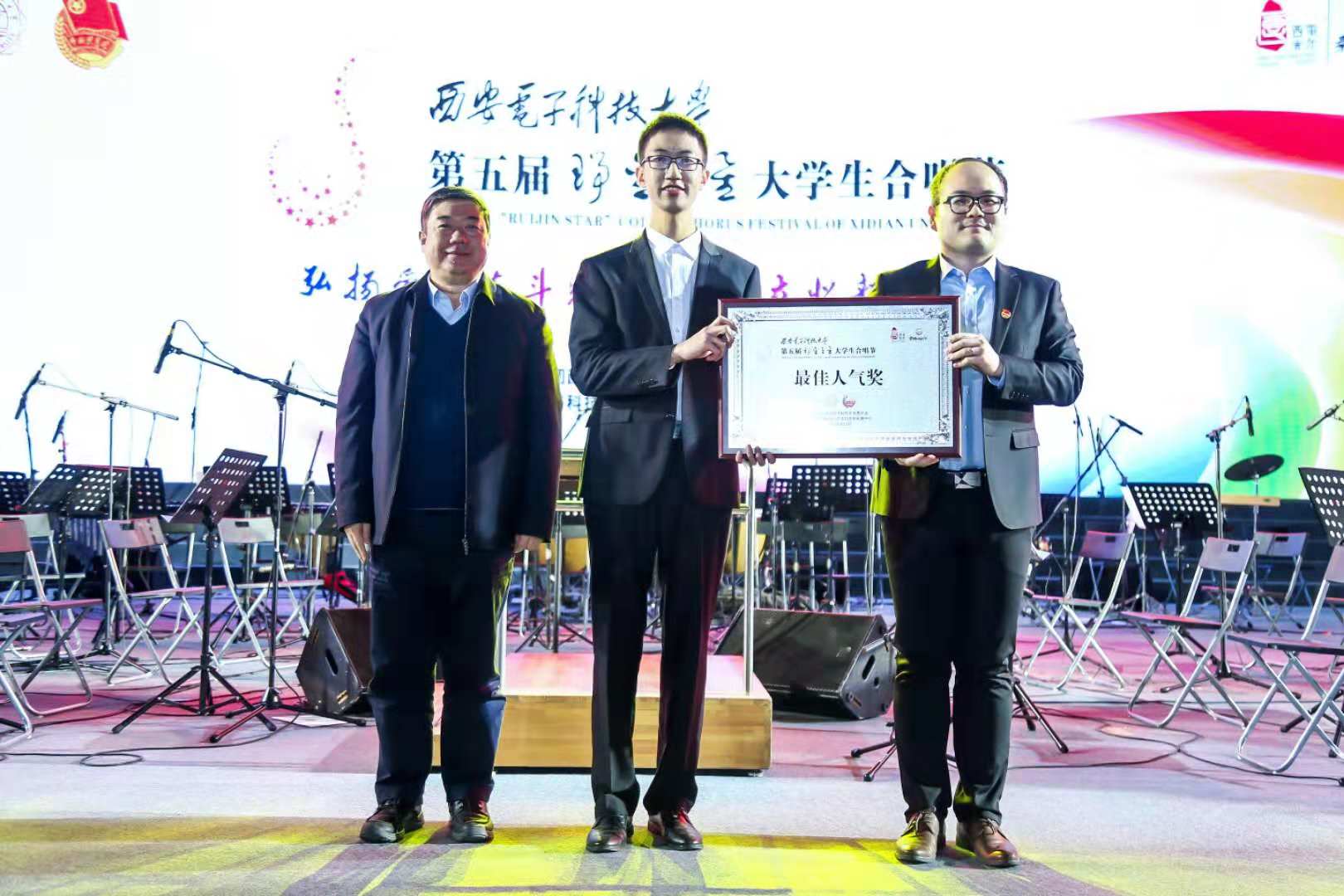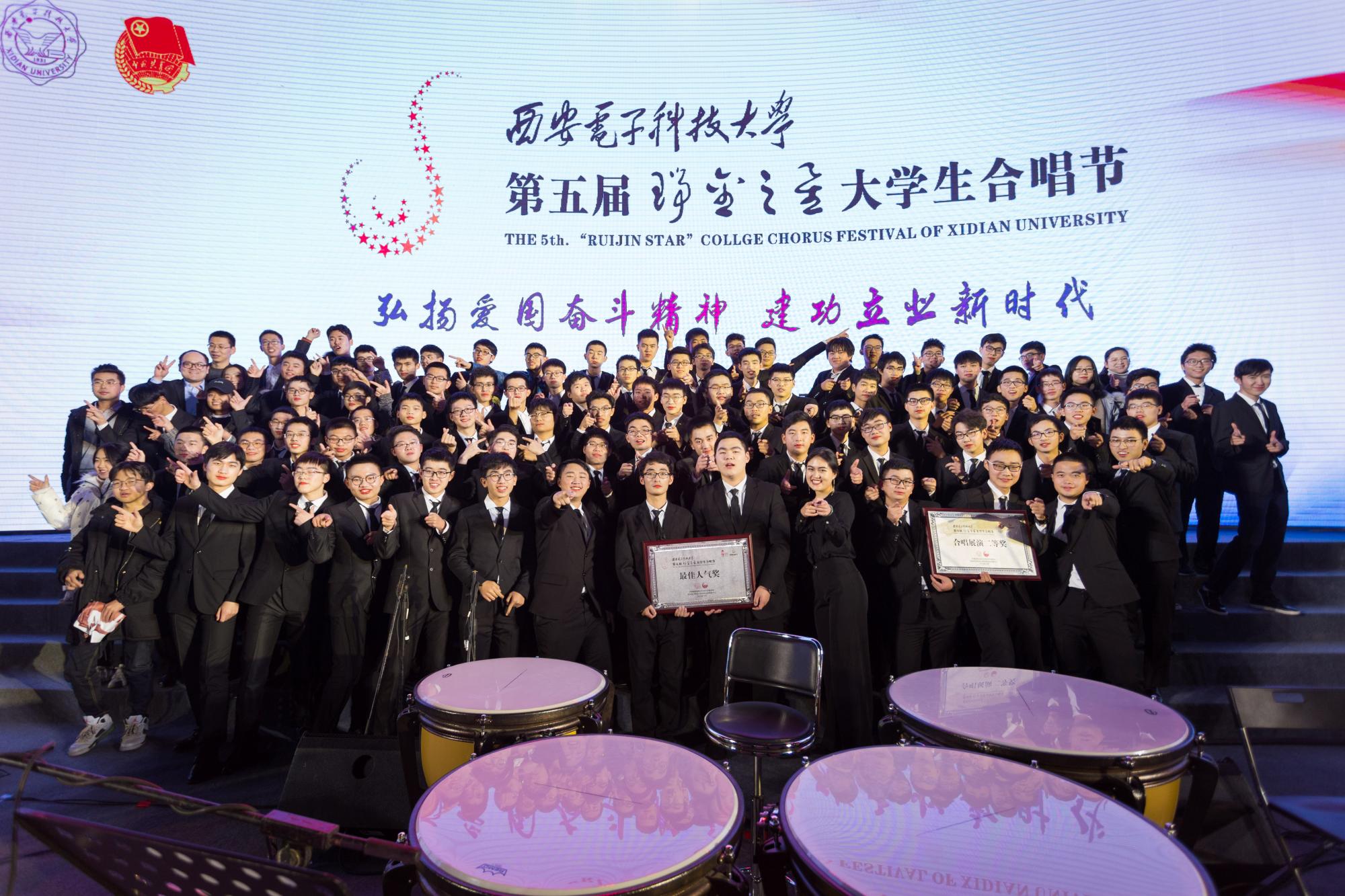 该活动旨在“用高雅的艺术引导人,用完美的艺术塑造人”,激发广大青年学生争做“有理想,有本领,有担当”西电人的热情和热爱学校、热爱集体、热爱艺术的情怀。萃梦合唱团选择演唱的《青春修炼手册》就是一首富有新时代昂扬气息的歌曲,合唱形式是纯男声合唱,分为男高音1、男高音2、男低音1、男低音2共四个声部。现场演唱时,合唱团成员随歌声活跃律动,配以大小提琴乐团悠扬伴奏,男高音嘹亮有力,男低音雄浑厚重,将歌曲中青春活力演绎的淋漓尽致,不仅唱出了青春的朝气蓬勃,更在各式精心设计的连环叠唱中彰显了恢弘大气,得到了台下评委的好评和观众的热烈反响,观众们纷纷打开手机灯光随歌声跃动,在一片灯海中为合唱团的演绎欢呼,将现场气氛推向高潮。