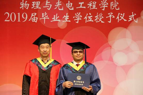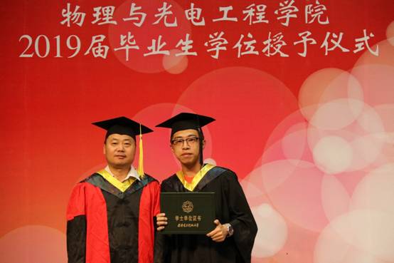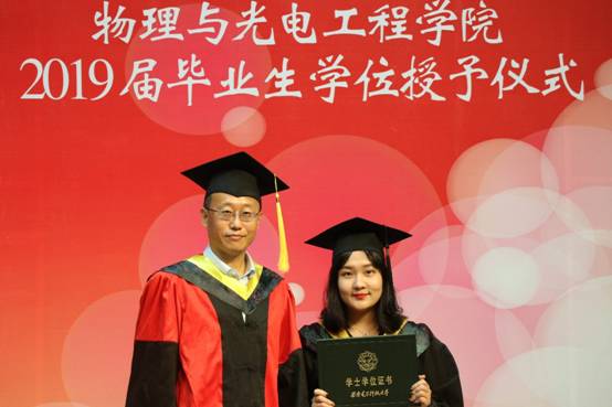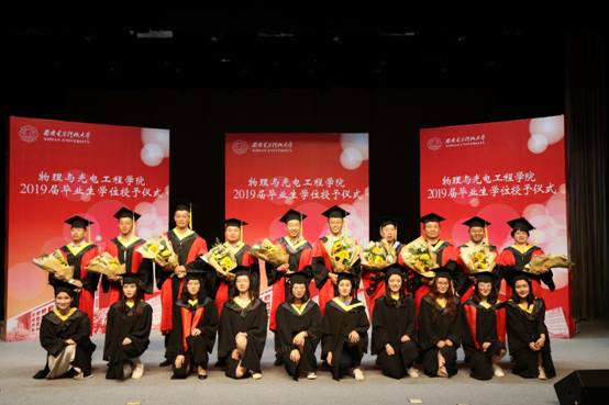 授位仪式开始,由学院独国社老师、邵晓鹏老师、曾晓东老师共同为2019届毕业生颁授学位。毕业生依次登台,鞠躬握手,接受拨正流苏,手持证书与老师亲切合影,为求学生涯画上圆满句点。