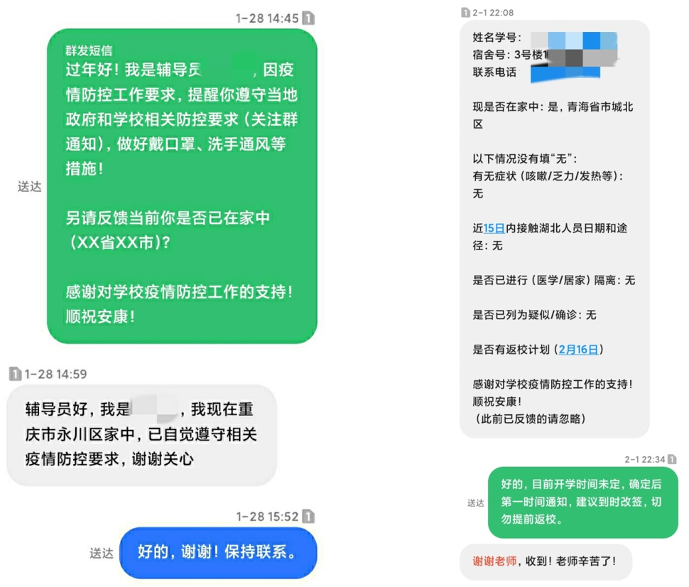 学院领导亲自指挥,辅导员带领班干部、学生党员及联络员构建信息反馈通道,与班级学生逐一联系对接,及时准确了解学生身体情况和思想动态,实现“疫情通”等信息填报快速高效全覆盖。学院还发布心理健康视频帮助调整学生心理状态,及时疏导学生出现的紧张、焦虑、猜疑、恐慌等心理情况。问卷收集学生在家进行线上学习的困难需求,为建档立卡的湖北籍家庭困难学生争取临时性困难补助,在明确疫情防控工作安排和要求的同时,关心解决好学生的实际困难。目前,学院本科生及研究生身体状况良好。
