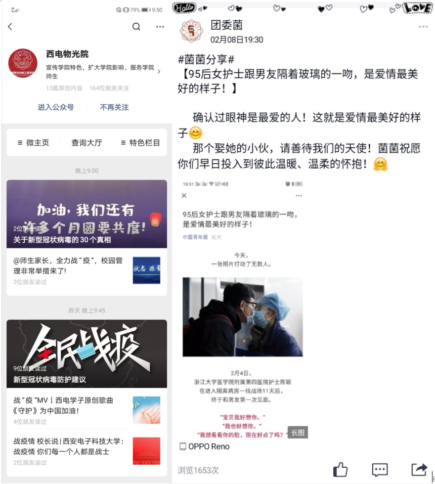 疫情发生后,学院依托新媒体矩阵平台,向师生普及疫情防控方法与公共卫生安全知识,及时跟进官方讯息,破除不实谣言,与师生暖心互动,关注师生身体健康与生活状况,扶正舆论导向,传播正能量,进一步提升师生防疫知识储备与应对能力,增强科学应对疫情的信心。各班级利用网络平台开展线上主题班会,组织班级学生线上开展活动,除了开展疫情防护知识教育外,深入开展爱国主义教育、生命教育、爱与感恩教育,强化学生纪律意识和社会责任感。