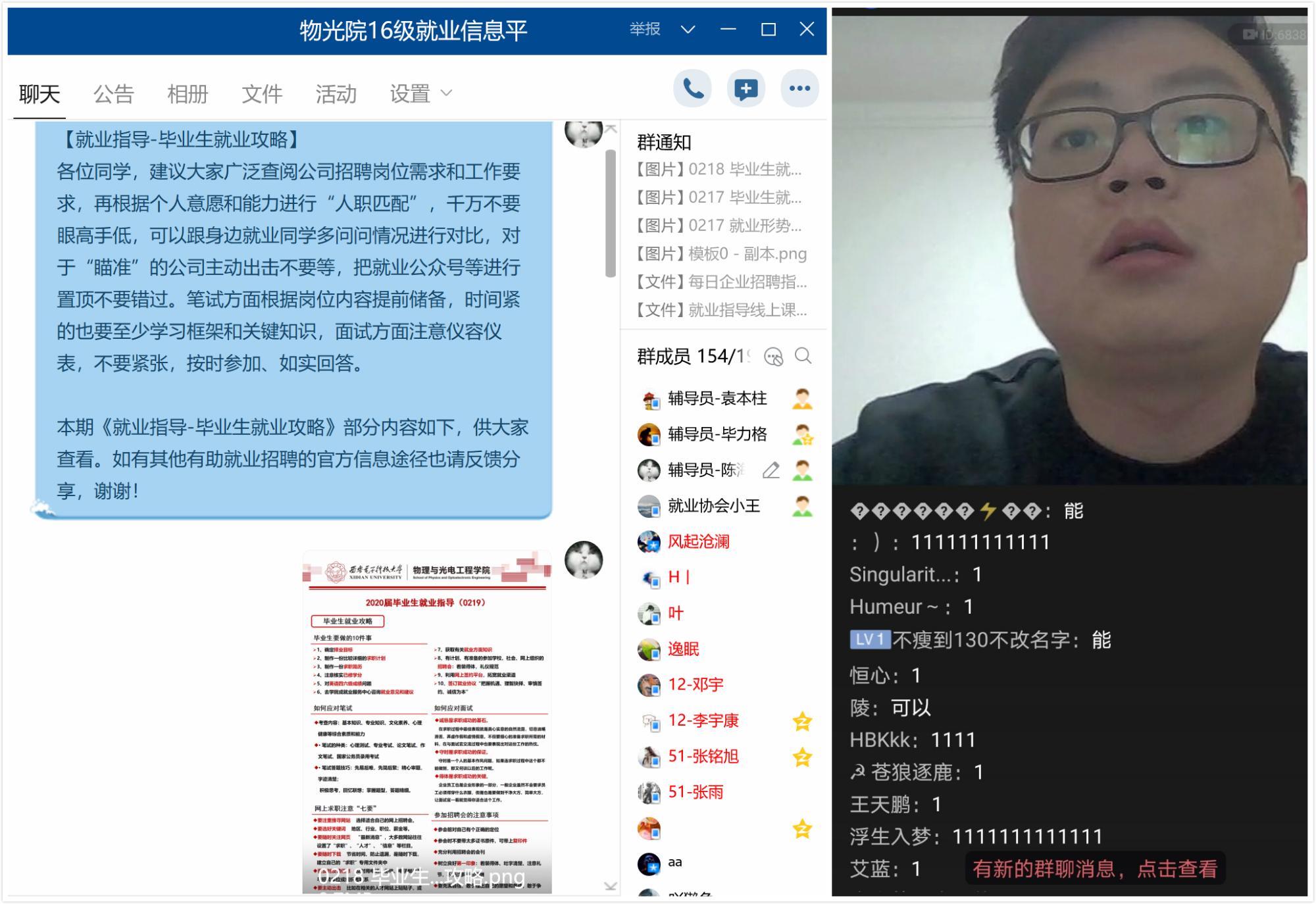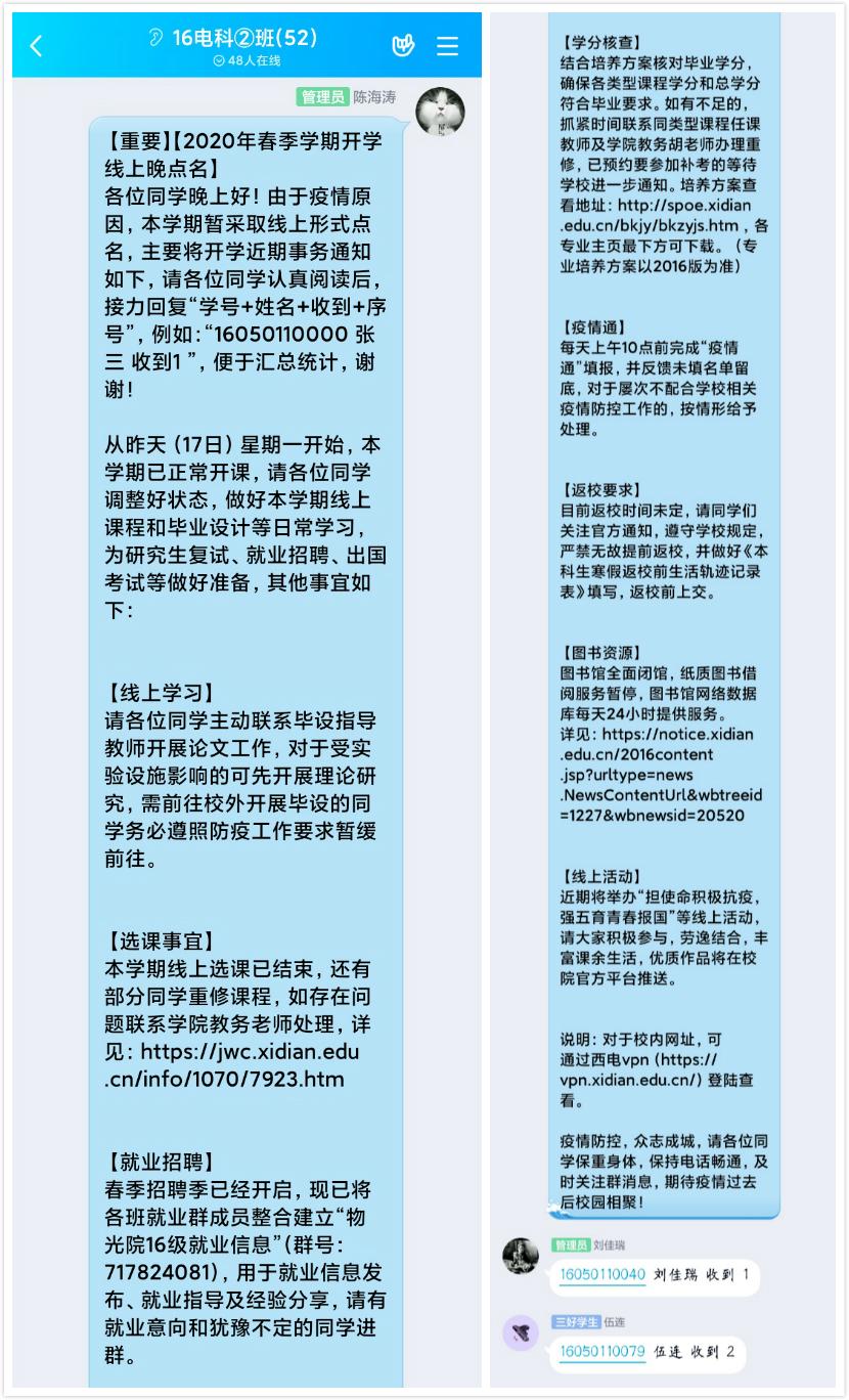 开学前夕,各年级进行线上晚点名,根据延期开学期间本科生教育管理工作要求,对近期学生关注的相关事宜进行解答安排。大四辅导员引导学生对照毕业要求再次核查学分,及时办理选课重修、补考预约等业务;叮嘱考研学生调整状态,主动关注高校复试安排进行线上备考;优化就业信息群管理,开展线上就业指导,引导学生将专业领域、工作地域、岗位要求与学生实际需求进行人职匹配,逐步提升就业能力,做好春季招聘能量储备;关注学生身体健康,坚持每日上午提醒学生测量体温,完成“疫情通”填报,记录“寒假返校前生活轨迹”;鼓励学生参加“担使命积极抗疫,强五育青春报国”线上活动,劳逸结合,丰富课余生活等。在开学前两周,大三辅导员就将学校将于2月17日进行网上教学的情况告知给所有学生,提醒大家做相关的硬件和心理准备,并对有线上学习困难的学生给予了相关帮扶。开学前一天,辅导员利用QQ平台对全体大三学生进行了线上晚点名。辅导员把最近学校和学院的相关政策给予了解读,并提醒大家认真对待线上教学课程,调整好生物钟,按时按点到相关平台上课。同时,辅导员也给学生强调了每日要完成“疫情通”填报和“寒假返校前生活轨迹”的记录,并在点名结束后回答了学生们的一些提问。