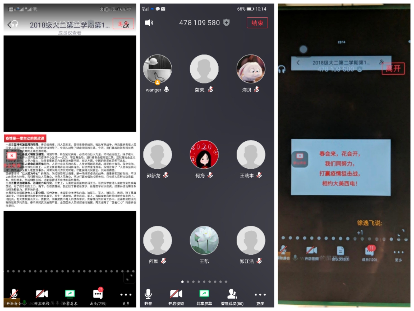 学院各年级通过不同平台,组织了线上“晚点名”,开展抗“疫”教育与开学动员教育工作。各年级辅导员通过分析了当前疫情形势、带来的挑战和对大家的要求,鼓励大家调整好个人状态,为新学期明确目标,完成好学业任务。2020新学期的“云”点名为大家开启了一个难以忘怀的新学期,大家也纷纷表示,开学“晚点名”后会以一个新的状态来应对这个难忘的学期。