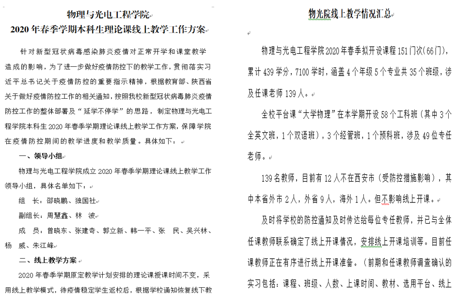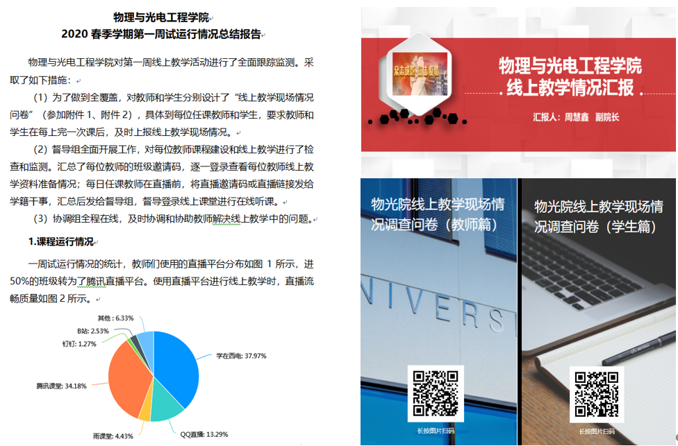 按照“延学不停课、不停学”的要求,学院积极组织开展线上教学,专门制定实施方案、应急方案、基本要求和工作建议,成立了领导小组、督导组、协调工作组等,保障线上教育教学工作正常进行。学院领导带领教学办公室同志、辅导员等积极组织师生开展线上授课培训、网络平台试用和调研反馈,及时掌握实际情况和存在问题并协调解决,协助任课教师开展在线课程建设。在第一周上课期间,学院通过网上问卷方式每日坚持在师生中开展调研,及时了解情况、解决问题,汇总分析形成报告,向有关部门提出具体意见建议,并总结了课程案例。学院还积极组织教职工开展线上教学课题研究工作,目前已向学校提交了两项课题申报书。