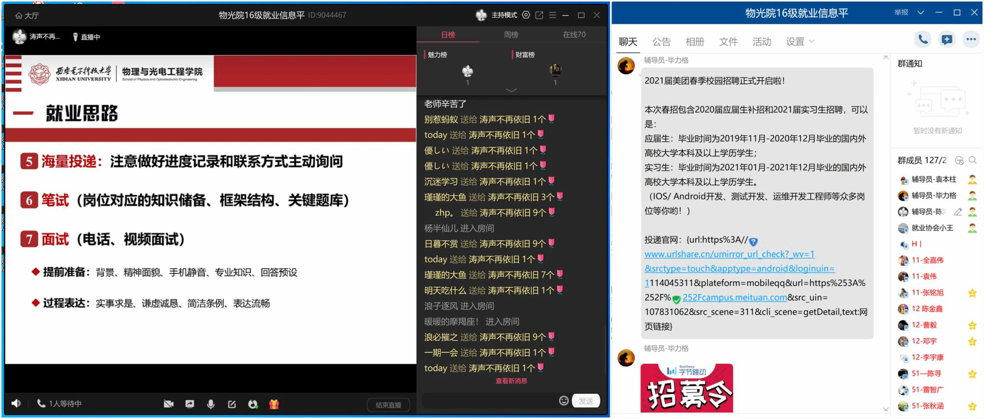 (通讯员:陈海涛)“本期就业指导直播开始了!进入房间的同学请敲1。”受疫情影响,毕业生春季就业应聘工作受到冲击,物理与韩漫基地