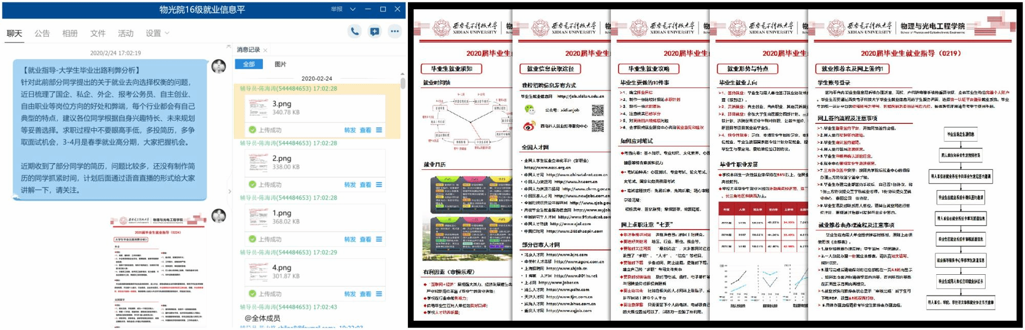 辅导员开设线上就业“微”指导活动,重点面向就业“零经验”的考研失利学生等群体,每周发布两期就业指导“微板报”,内容涉及就业形势分析、求职计划安排等;由实习就业经历丰富的同学担任就业线上联络员对接班级,分享招聘信息和方法技巧;校友、导师结合当前行业发展需求,为毕业生提供线上个体咨询;家校共育,向家长介绍校院就业服务和招聘信息,发挥其在疫情期间对毕业生的督促作用,促进毕业生积极求职。