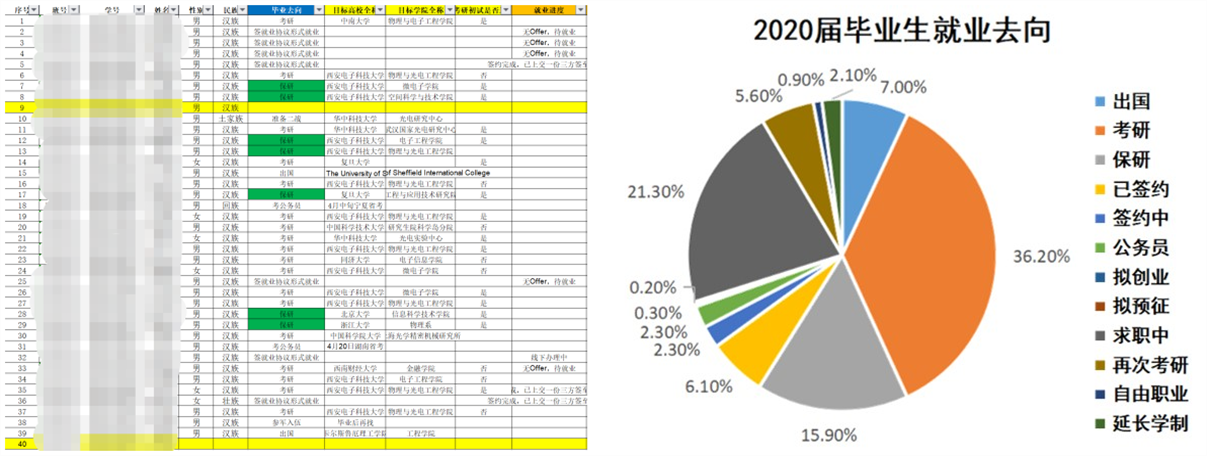 大四学年开始前,学院就针对2016级毕业生开展了就业考研等意向的初步摸排,建立电子化就业台账并动态跟踪,辅导员掌握每一位学生的就业意向和动态,尤其在秋季招聘高峰、考研报名结束、研究生初试成绩公布等关键节点进行更新归类,有针对性地进行指导帮扶,开展“优研推免政策讲解”“学长学姐回娘家”“就业分享会”等活动,引导学生明确毕业去向,树立正确的就业择业观。