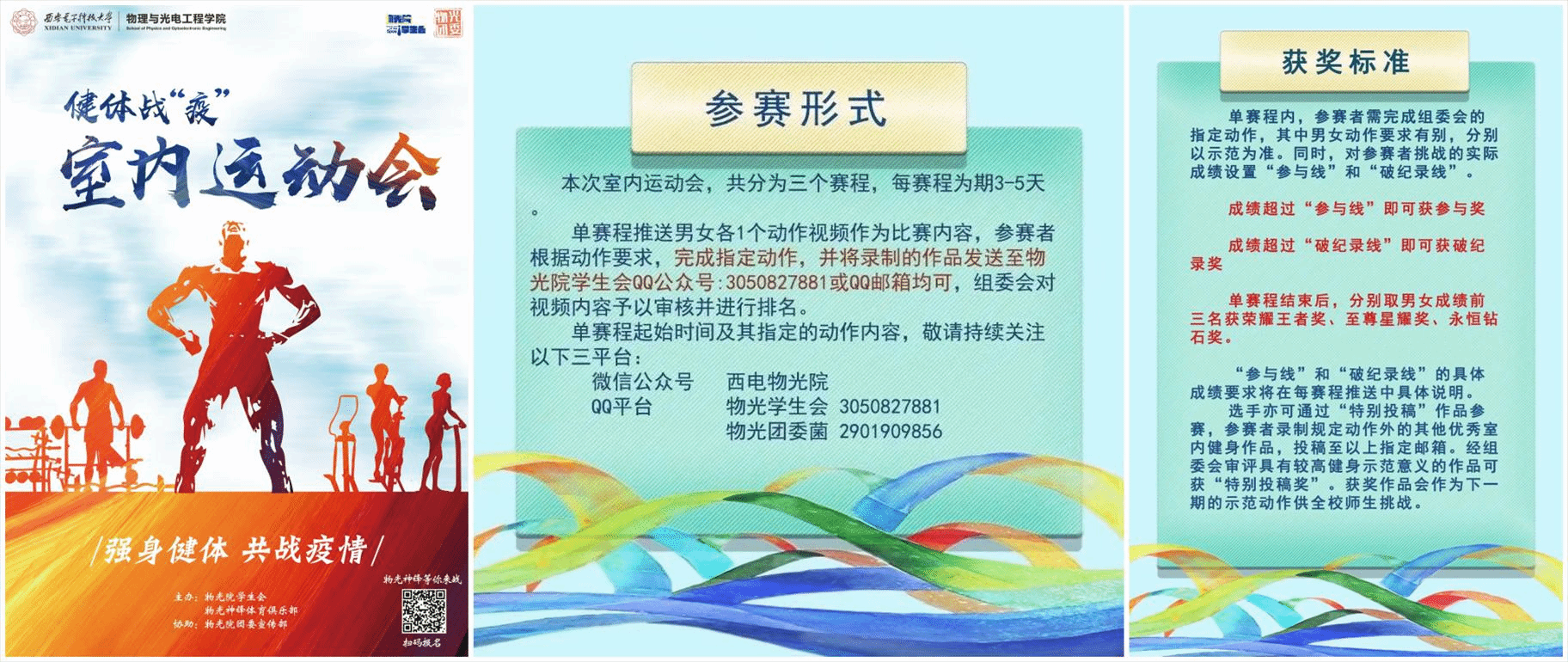 依托线上平台举办“室内运动会”,打响线上健体战“疫”。本次活动由学院本科生辅导员刘昕玮、毕力格设计策划,学院学生会、团委、物光神锋体育俱乐部具体实施。