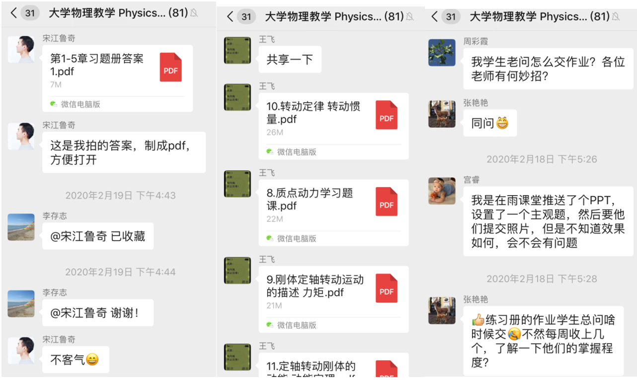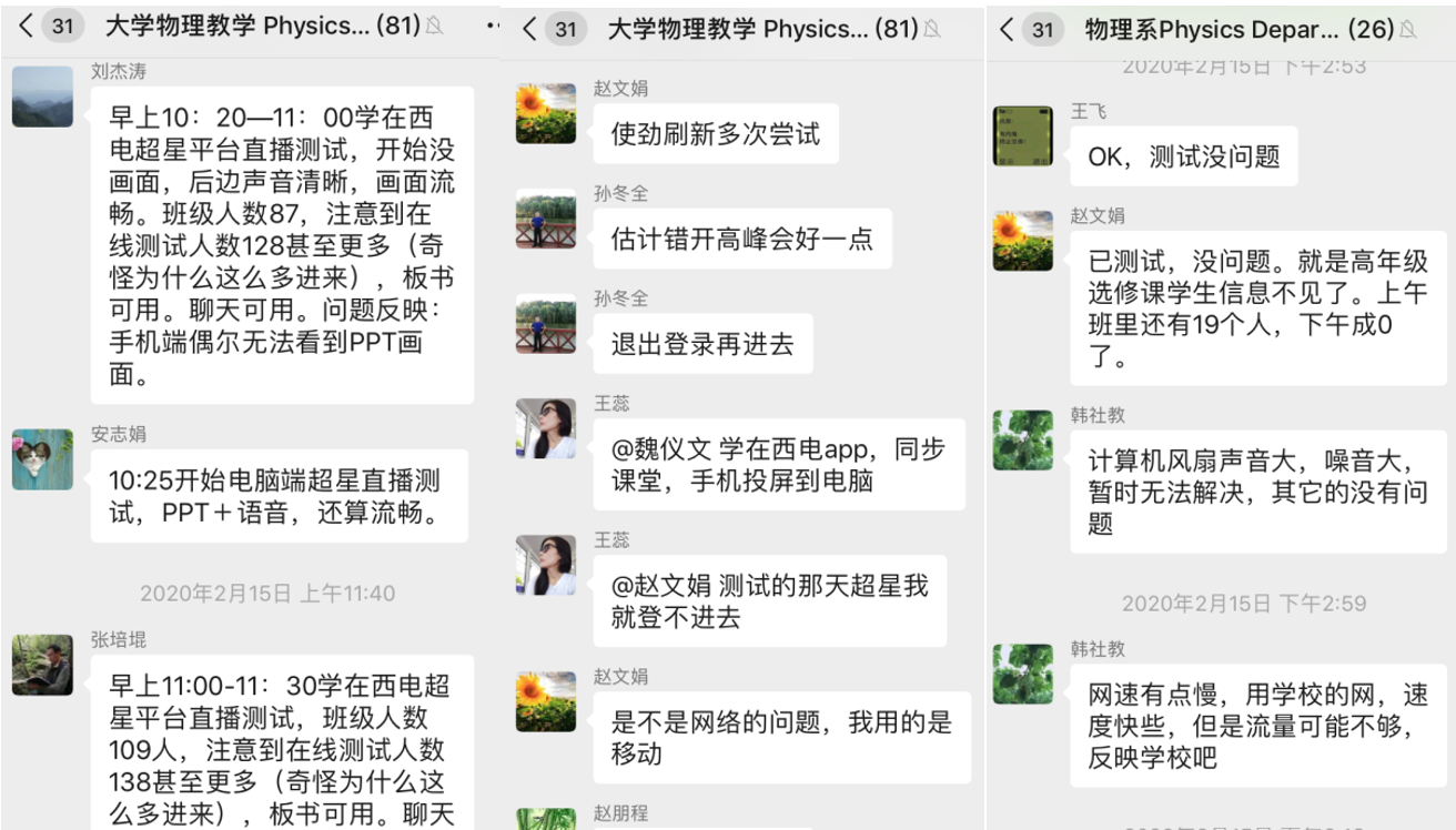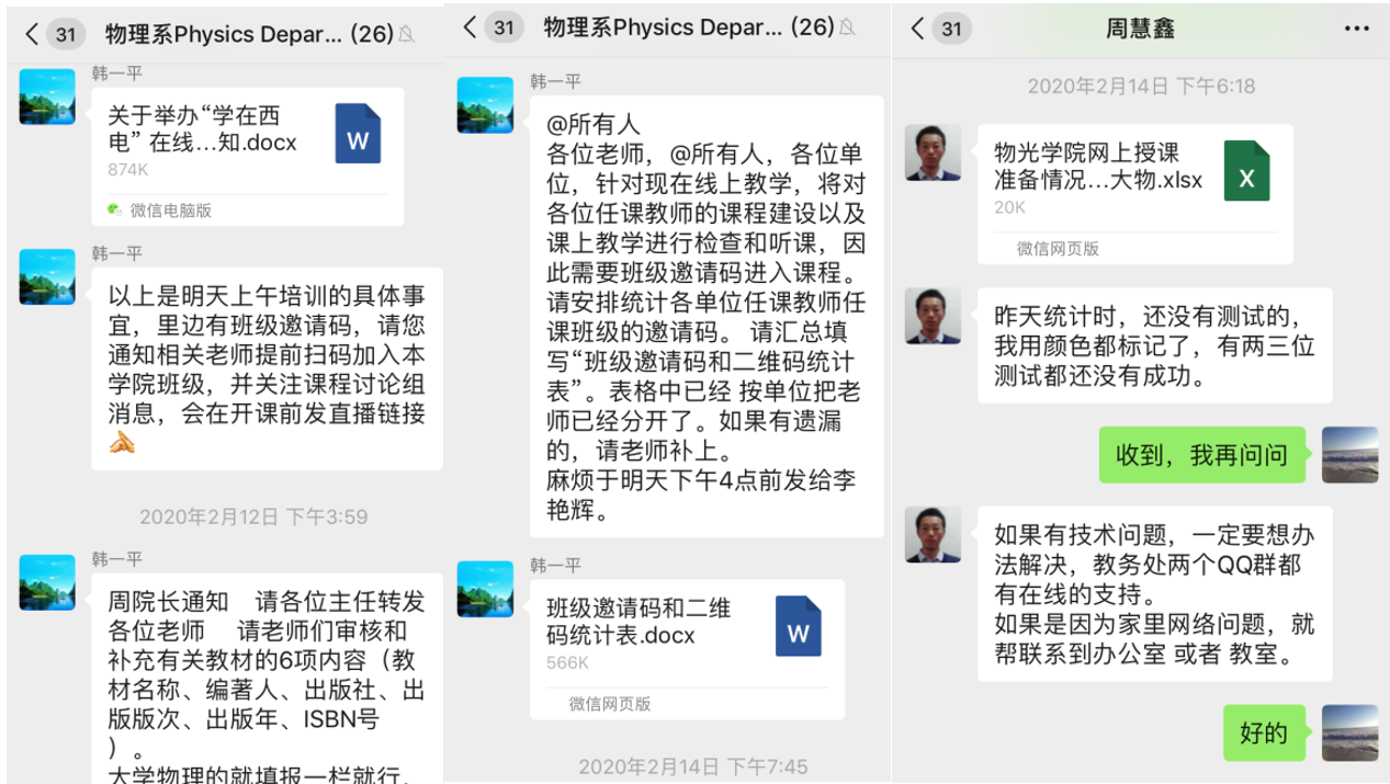 在接下来的教学中,不管是学生还是教师,对于这种线上的教学都还需要一定的时间来适应和提高教学效果。为了保证教学质量,大学物理课程组老师,依然会通过工作微信群,相互协助,共同备课,确保上课质量。同时与学生细心沟通,确保所有学生到课学习,并不断采集学生的反馈意见,不断提高学生的学习效果。在这个特殊时刻担当起作为高校教师的责任,为西电基础教学贡献自己一份微薄的力量,默默奉献,践行初心使命!
