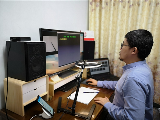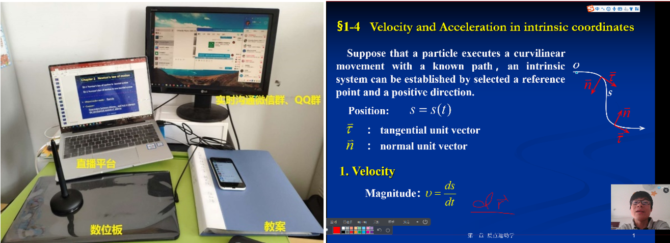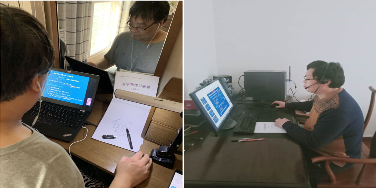 为了把大学物理“直播”课程上好,课程组每位老师都重新精心准备了线上教学的教案,揣摩线上教学问题,在试播阶段发现问题,解决问题,李存志老师在开课前反复研究线上课程上课的方式,害怕网络出现问题,准备了好几种备用方案。郭艳艳老师、崔继伟老师给重修班学生上课,时间在晚上,反复沟通、确认上课人数,确保不让一个学生掉队。王欣明老师为了达到平时教学中的板书和ppt结合效果,通过摄像头在纸上取景,并将摄像头取景画面和ppt放映画面通过屏幕共享功能同时直播。经过这样的处理,可以在讲授ppt的同时,实时书写进行板书演示,尽可能地达到和教室教学相同的效果。