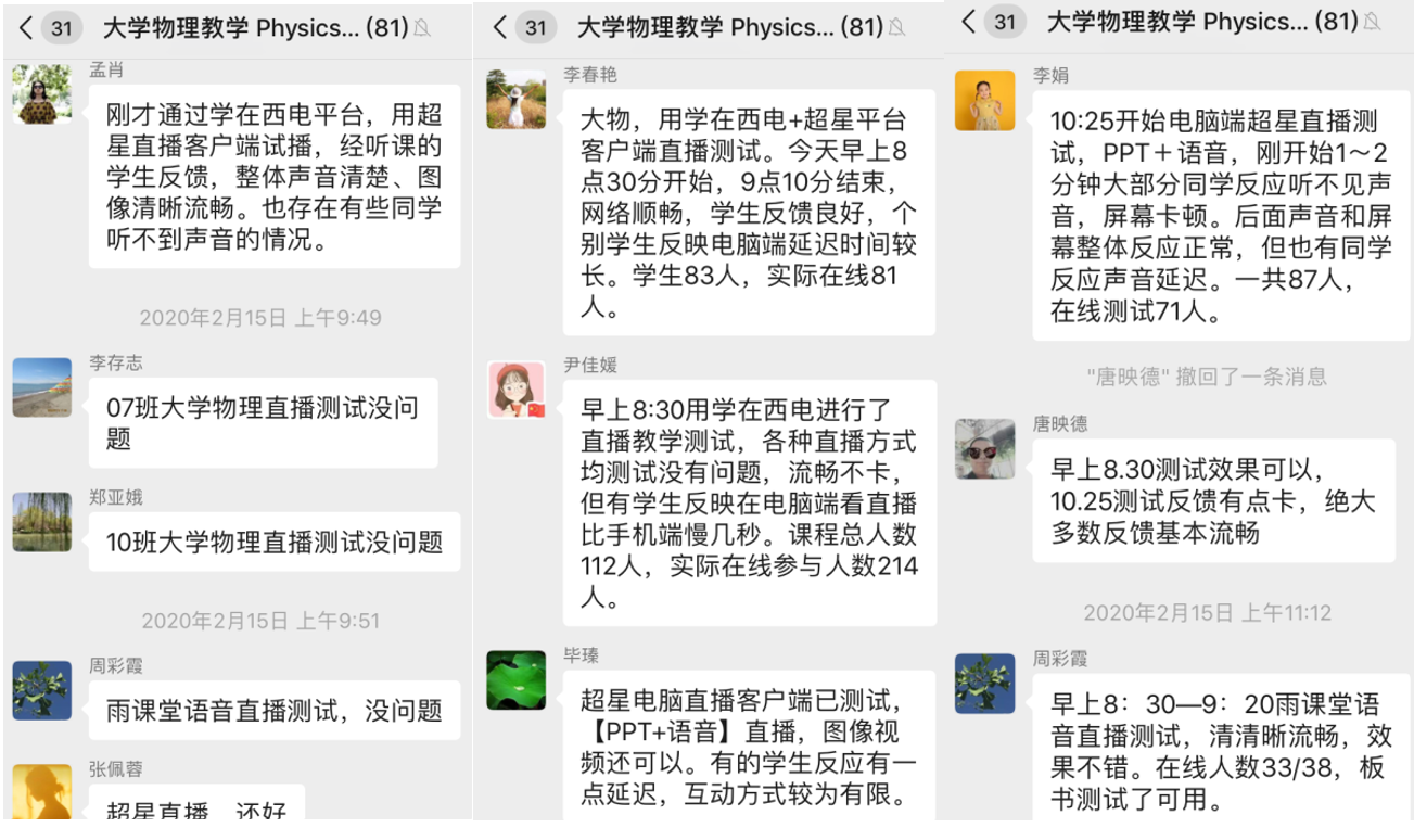由于大家都是初次面对直播教学,难免心里没底,课程组老师也是从“学生”做起,认真学习如何网上教学,有问题互相讨论,有心得互相分享。老师们每上完一节课都在教学群里反馈上课的情况,包括上课时间段、使用的在线平台,上课方式、网络情况、学生状态等等,非常详细,这些都是为了给其他老师借鉴,共同将每一节课做到完美。