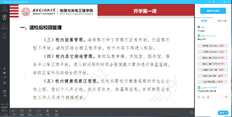 本次“开学第一课”,是疫情以来学院第一次线上结合线下的周点名,它架起了学校和学生之间的桥梁,让学生们在这个特殊的时期,更有信心、更有斗志迎接新学年的到来。大家在周点名后纷纷表示,看到学校的封闭式管理、晨午晚检等完善的防疫制度,自己心里踏实多了,更要重视来之不易的校园生活,在疫情防控的淬炼中谱写青春的担当。