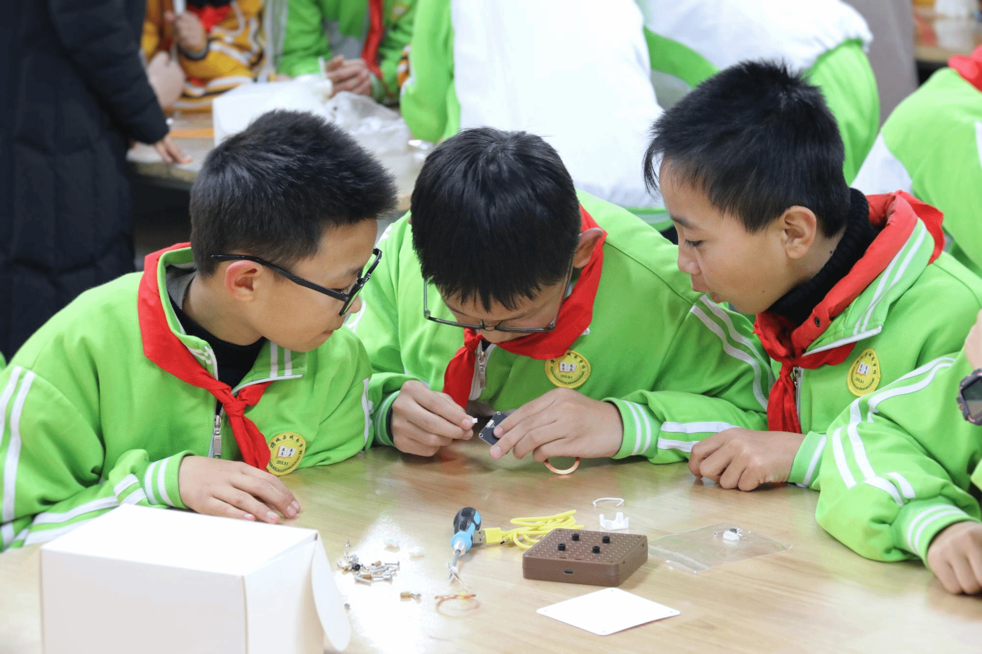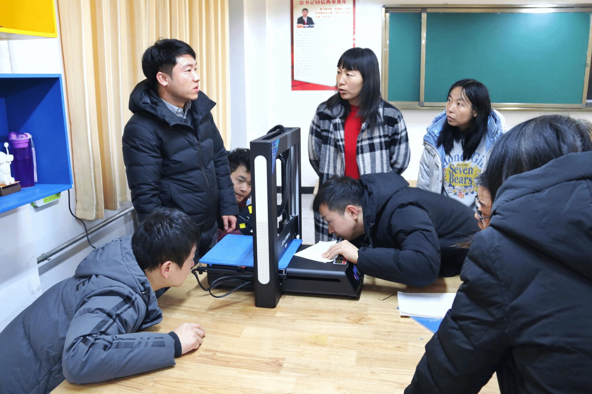 紧接着,姬策面向“科创小屋”第一期学生开展了CIE机器人实践课程,学生们分成小组动手实操,结合教师讲解对电子元器件进行辨别,同学们配合下完成组装,历时一个半小时最终形成了小组作品,城南学校教师就3D打印机组装使用维护等同西电教师展开交流。