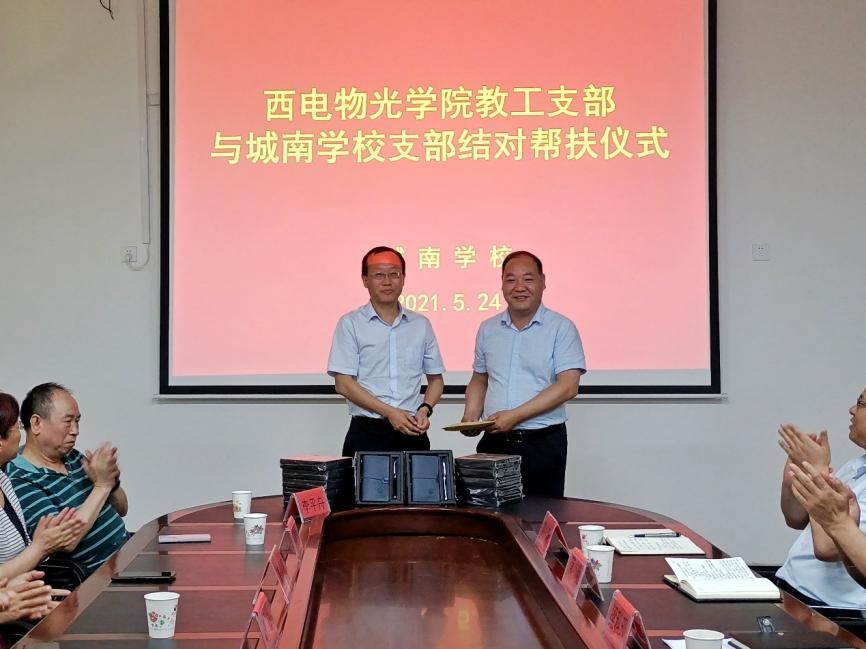 邵晓鹏代表学院向城南学校捐赠善款,用于学校建设和学生帮扶。李平舟代表物光院教工党支部向城南学校党支部捐赠毛泽东主席为西电题词“全心全意为人民服务”主雕塑纪念品和学习物资,开启两校党支部结对共建新篇章。黄军荣、辛红邀请城南学校师生来西电参观交流,感受“学在西电”浓郁学风和多彩大学文化。武颖丽介绍了物理实验中心正在承办的中国大学生物理学术竞赛西北赛的筹备进展以及历年取得的优秀成绩。