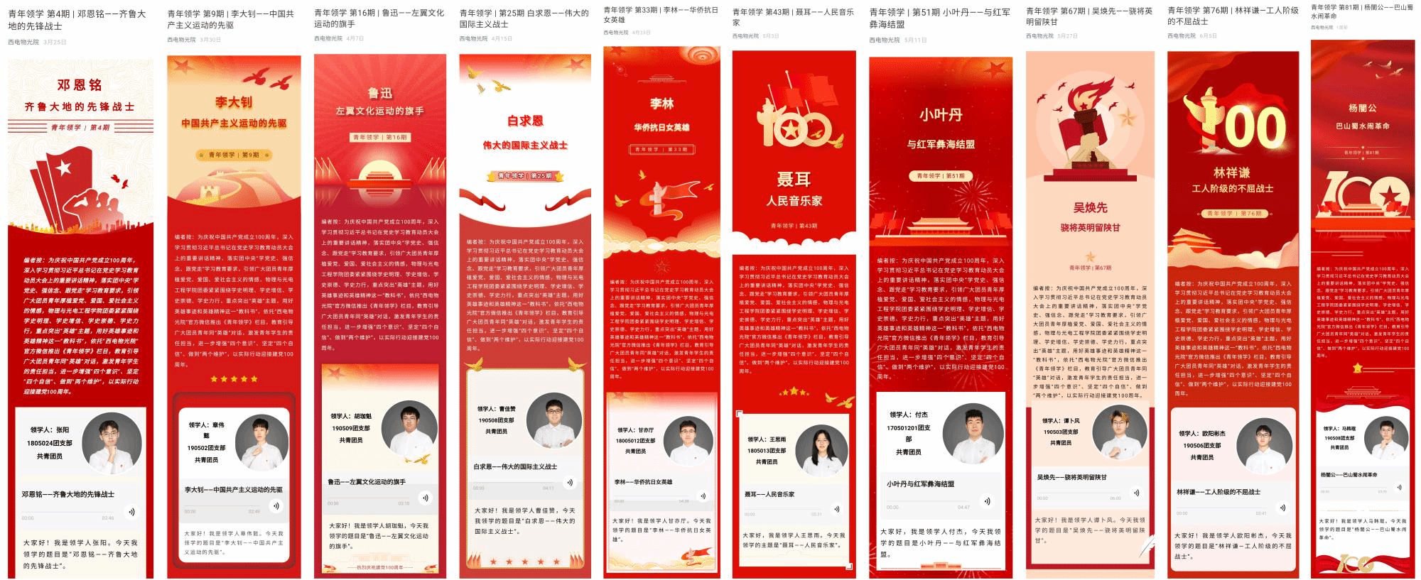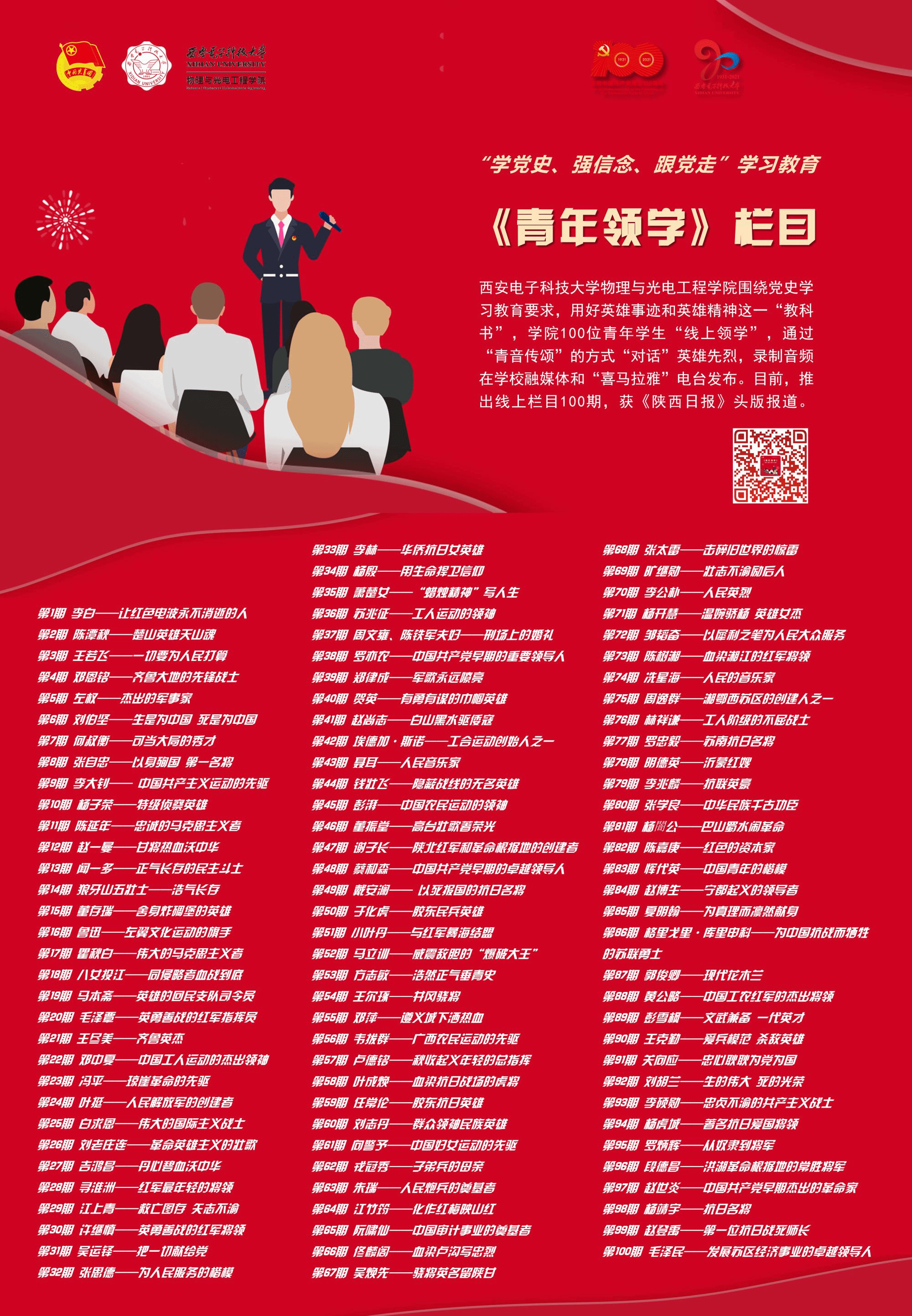 开设党史学习教育专题栏目《青年领学——把英雄故事讲给你听》,100位青年学生担任“党史领学人”,深入挖掘英雄模范人物典型事迹100项,通过“青音传颂”的形式对话英雄人物、讲好英雄故事、分享学习感悟,录制音频在“西电物光院”官方微信和“喜马拉雅FM”电台推出线上栏目100期,深受师生好评。
