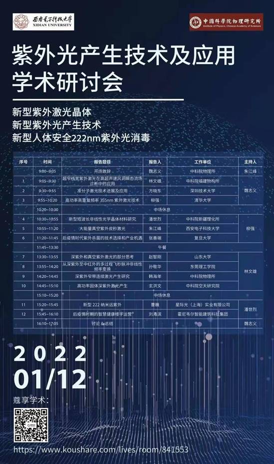 联合中科院物理所举办“紫外光产生技术及应用研讨会”。研讨会针对紫外光的产生、紫外激光晶体技术以及紫外激光在消毒杀菌和智慧健康等领域的应用,邀请国内多个科研院所和科技企业进行交流讨论。星际光(上海)实业有限公司作为新型紫外光运用领域的领先企业,已将222纳米紫外光用于新冠消杀领域,作为嘉宾参加本次研讨会。