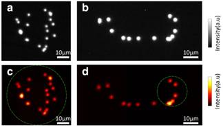 图2(a-b)荧光目标(无散射介质);(c-d)重建图像。虚线圆圈表示光学记忆效应范围。